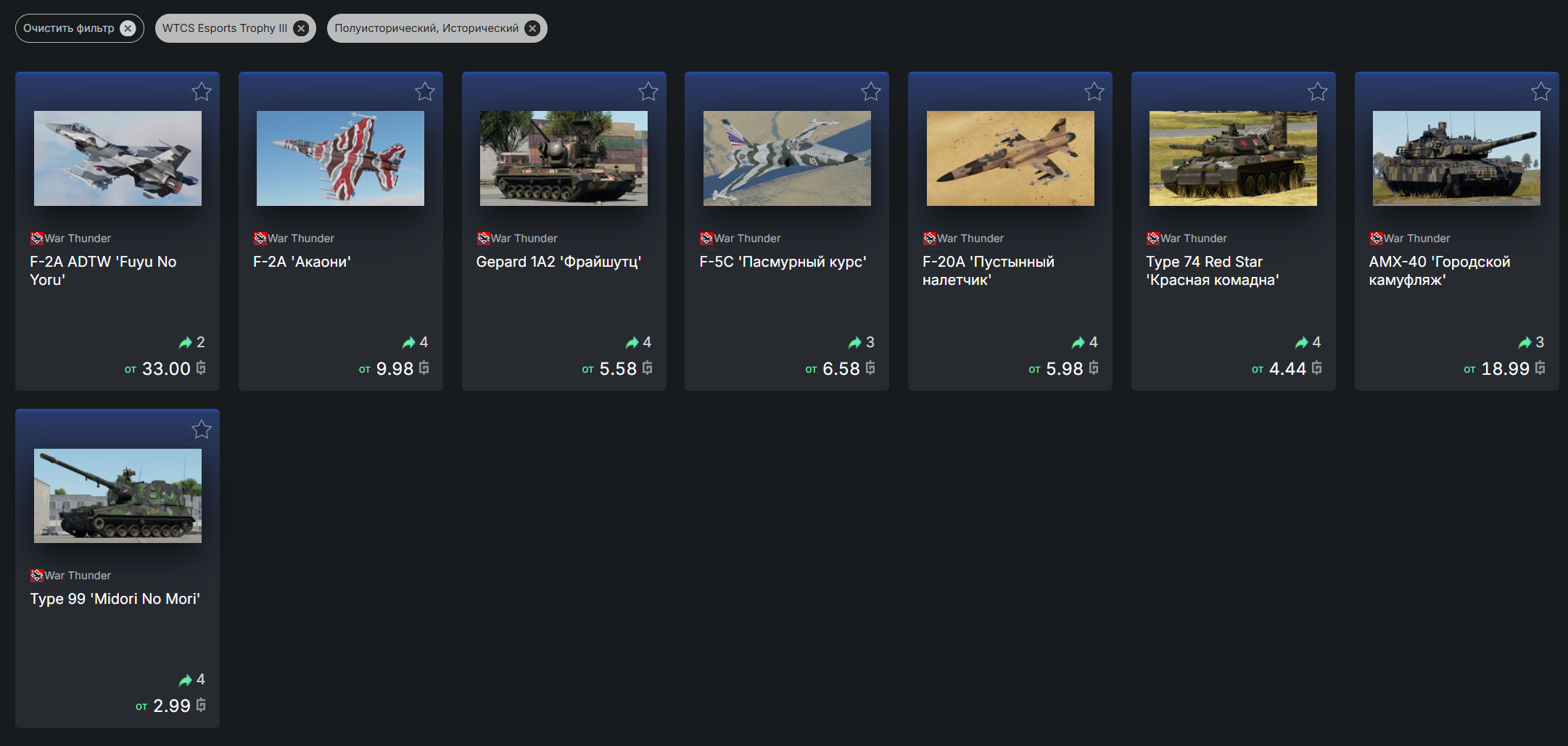 Встречайте Третий трофей WTCS, полный потрясающих камуфляжей от авторов с WT.Live! Всего в него входят 38 новых камуфляжей: 19 для самолётов, 18 для наземной техники и один вертолётный. Широкий выбор Боевых рейтингов и разнообразие стилей позволят вашим наборам техники выделяться на фоне остальных!