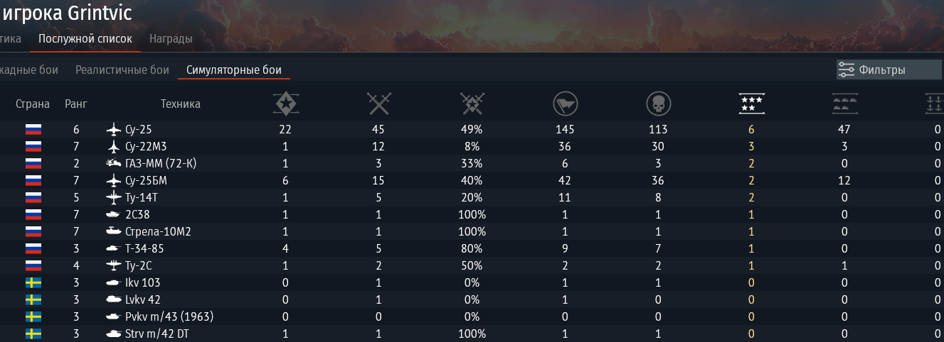 Я не видел в вашей статистике попытки вылетов на ту4 по наземке. Да и большого налета на су25 (вообще вылетов на нем) я тоже не наблюдаю. Я не высказываюсь за технику на которой я никогда не летал, но раз за разом вы игнорируете ту, что есть в режиме.