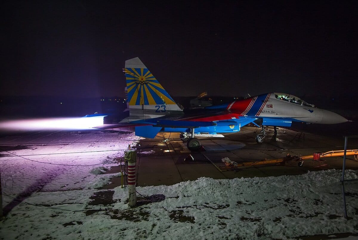 В ангаре (1) самолет, очевидно, стоит с незапущенными двигателями, крайнее перед выключением положение РУДов - МГ, но створки “прикрыты”, а на ПФ-110% (2) - полностью раскрыты. На 3 и 4 фотографиях изображена правильная работа двигателей - самолеты на взлете используют ПФ, на 5 “стояночное” положение створок сопел. Есть предположение что данная проблема присутствует не только на Су-27, но и других самолетах с ФКС.
