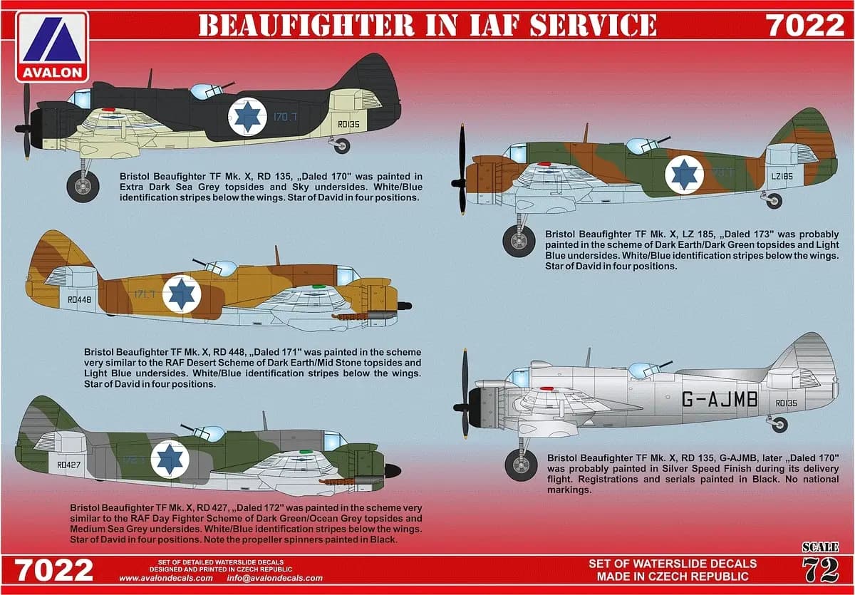 История данного самолета, а точнее, партии самолетов с серийными номерами Королевских ВВС RD135, RD448, RD427, LZ185, NT929 и NV306, последний из которых был списан еще в Великобритании весьма интересна. Когда новообразованному израильскому государству стала угрожать опасность нападения и вторжения, был срочно объявлен сбор боевых самолётов любого типа для формирования военно-воздушных сил. Бывшему пилоту Королевских ВВС на службе ВВС Израиля каким-то образом удалось собрать шесть бывших в употреблении Beaufighter TFX (серийные номера Королевских ВВС RD135, RD448, RD427, LZ185. NT929 и NV306). Британское правительство ввело эмбарго на поставки оружия в Израиль, поэтому нужно было найти тайный способ доставки. Шесть самолётов были зарегистрированы на компанию R.D1ckson and Partners в 1948 году, хотя в статье IAF говорится, что они были куплены на имя пилота Королевских ВВС по фамилии Диксон. Сделкой занимался агент IAF по закупкам по имени Имануэль Цур. Самолёты были зарегистрированы под номерами G-AJMB — G-AJMG, были собраны в июле 1948 года и базировались на аэродроме Хадденхэм, в Тейме, Оксфордшир. Было получено разрешение на перелёт этих шести самолётов на север, в Шотландию, для съёмок фильма о подвигах пилотов Beaufighter Берегового командования во время Второй мировой войны. Фильм, конечно же, был отвлекающим манёвром, и после взлёта произошла трагедия, в результате которой NT929 потерпел крушение 28 июля 1948 года, в результате чего погиб пилот Митчелл Кэмпбелл, а оставшаяся пятерка самолетов направились в Израиль - RD448. RD135, , RD427, LZ185 и NV306.