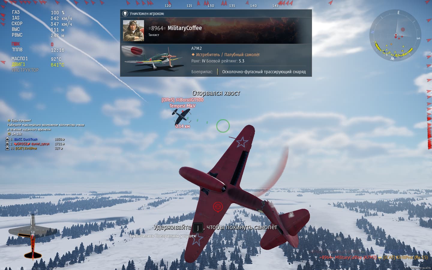 темпест продолжает полёт без потери ЛТХ после попадания нескольких 23-мм фугасов, в то время как Як разваливается от одного попадания…