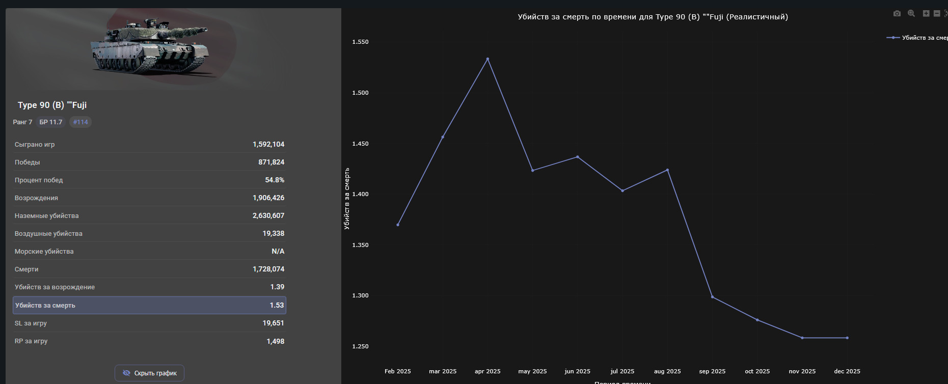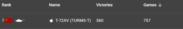 Ну и всего-то самый нескромный по статистике танк у советов со своим 2.4 КД. Те кто лучше или акционки древние или редкие/непопулярные премы, а ближайший линейный танк - Т-64Б с 1.66 КД.