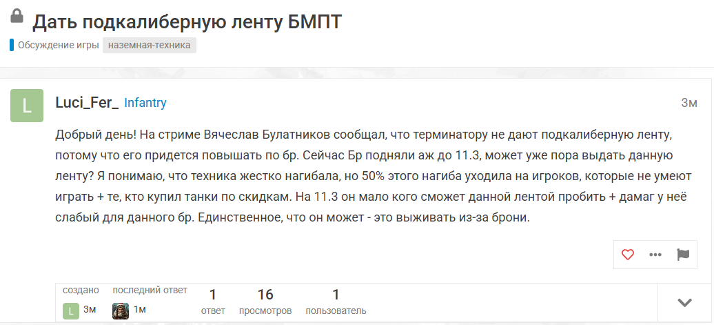Ничего удивительного, в тг и вк ещё больше таких. Хотя было ну просто супер очевидно что его занерфят, причём скорее всего жестче, чем пуму в своё время. Сам подумывал насчёт БМПТ-72, но отбросил эту мысль так как жить на 10.3 ему тогда недолго оставалось