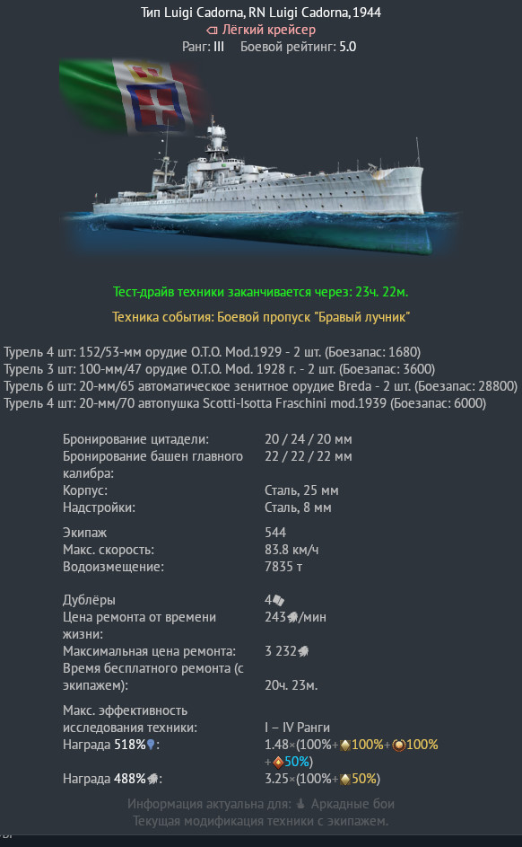 Да это фарм машина, вот здесь меня разработчик порадовал. И к флоту люди потянутся из-за лютейшего фарма (на танках и не снилось), и итальянский флот так сильно пушить не будут, прокачка будет быстрее в большом флоте Италии и сам по себе располагает данный легкий крейсер к фарму из-за хороших ТТХ. И при всем при этом перед боем на Луиджи Кадорна уровень экипажа был 1 (единица), вообще Италию не качал, от слова совсем, представьте уровень экипажа асы, где все параметры 10. Подрыв кормы у противника гарантирован. Просто bellissimo!