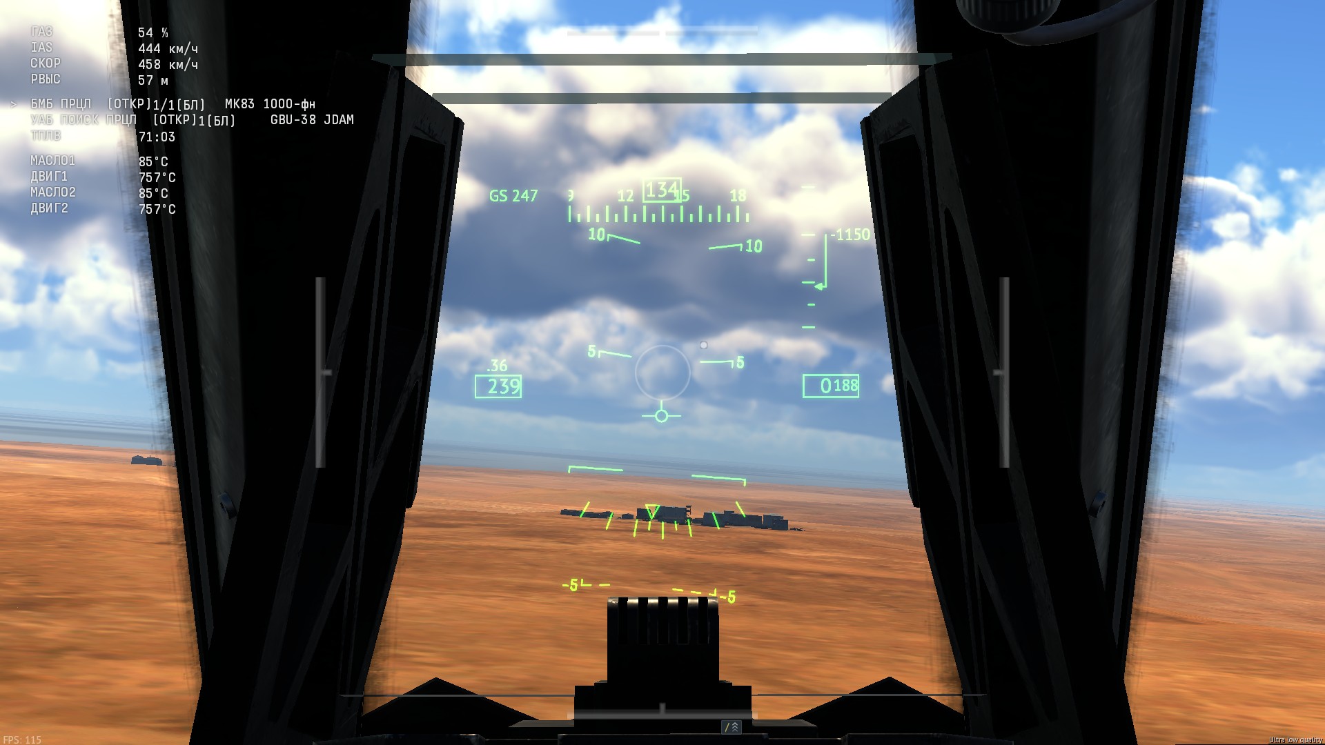 Нет заявленной точки попадания бомб на ИЛС в Авиа СБ. Хотя дословно, как писалось в “Вики-игры”, там прям должно было быть: “Наличие [тепловизора] существенно помогает искать цели как в дневное, так и в ночное время суток, а [баллистический вычислитель] позволяет сбрасывать бомбы с высокой точностью”. Так где он? (Учитывая, что здесь в игре есть баг: если, к примеру, взять бомбы, то может всегда в ИЛС “висеть” только маркер пушки, бессменно! Я уже составил сетап: одну свободнопадающую Мк-83 и JODAM GBU-38, но всё так же — на ИЛС так и не появилось ни одной даже точечки маркера упреждения баллистического вычислителя! На А-7, на которых учили пилотов для F-117, есть, а на самом её нет).