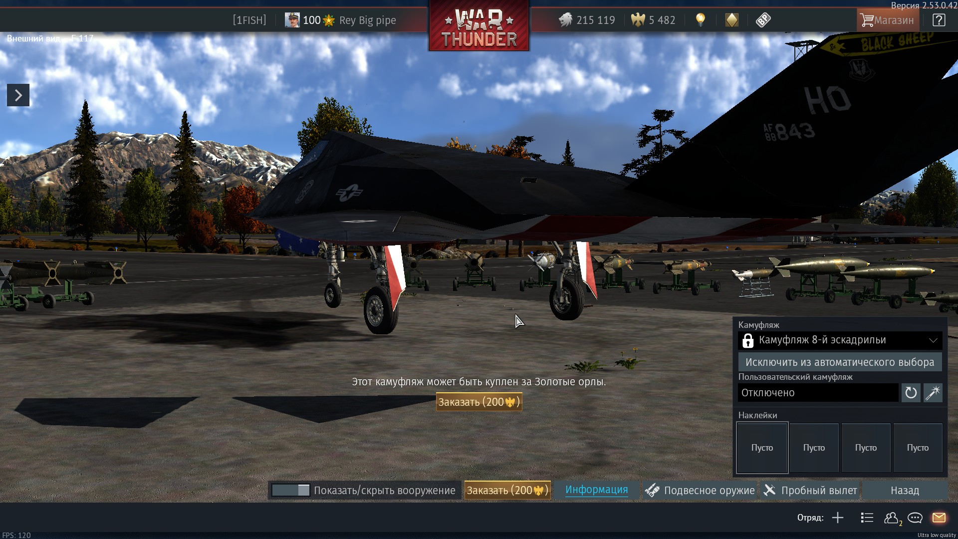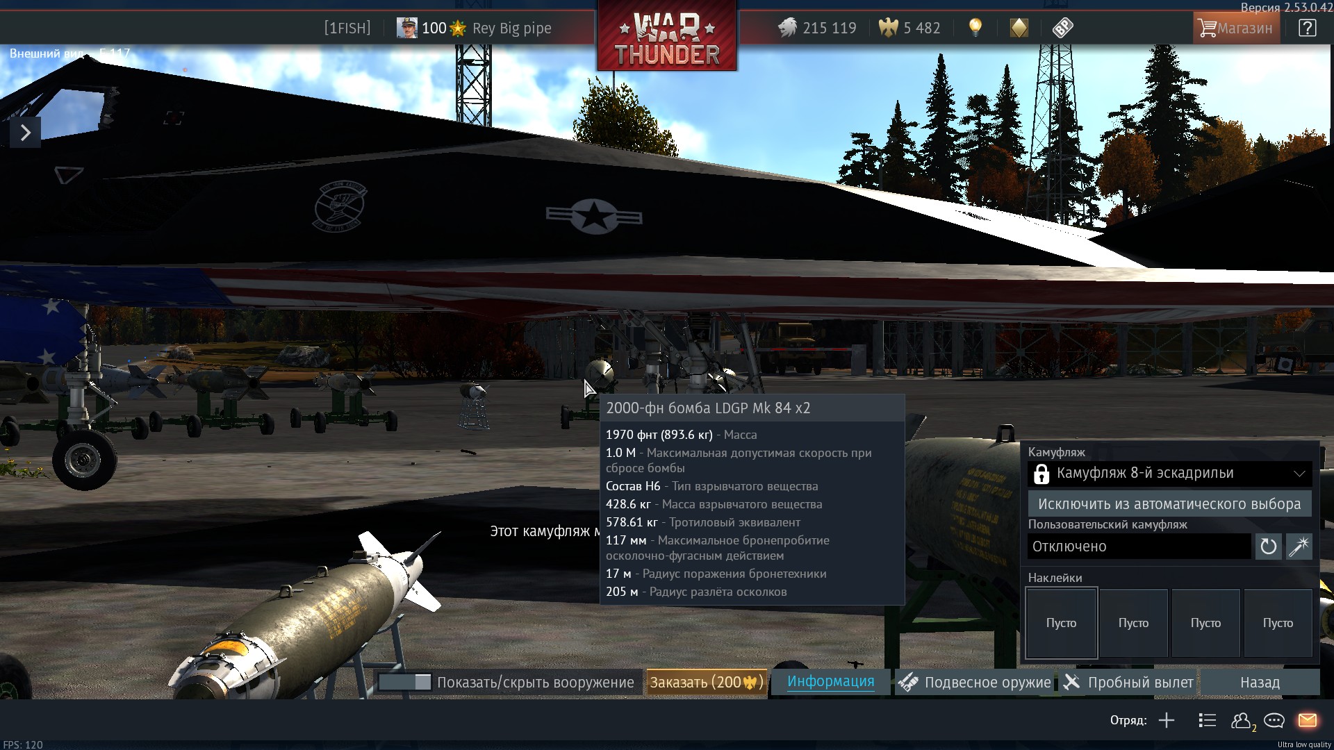Начальный сетап вооружения… Тут вообще эмоции – как, по-вашему, можно качать этот самолёт в СБ, если в стоке по дефолту дают всего два вида 250-килограммовок, и можно взять всего две штучки…