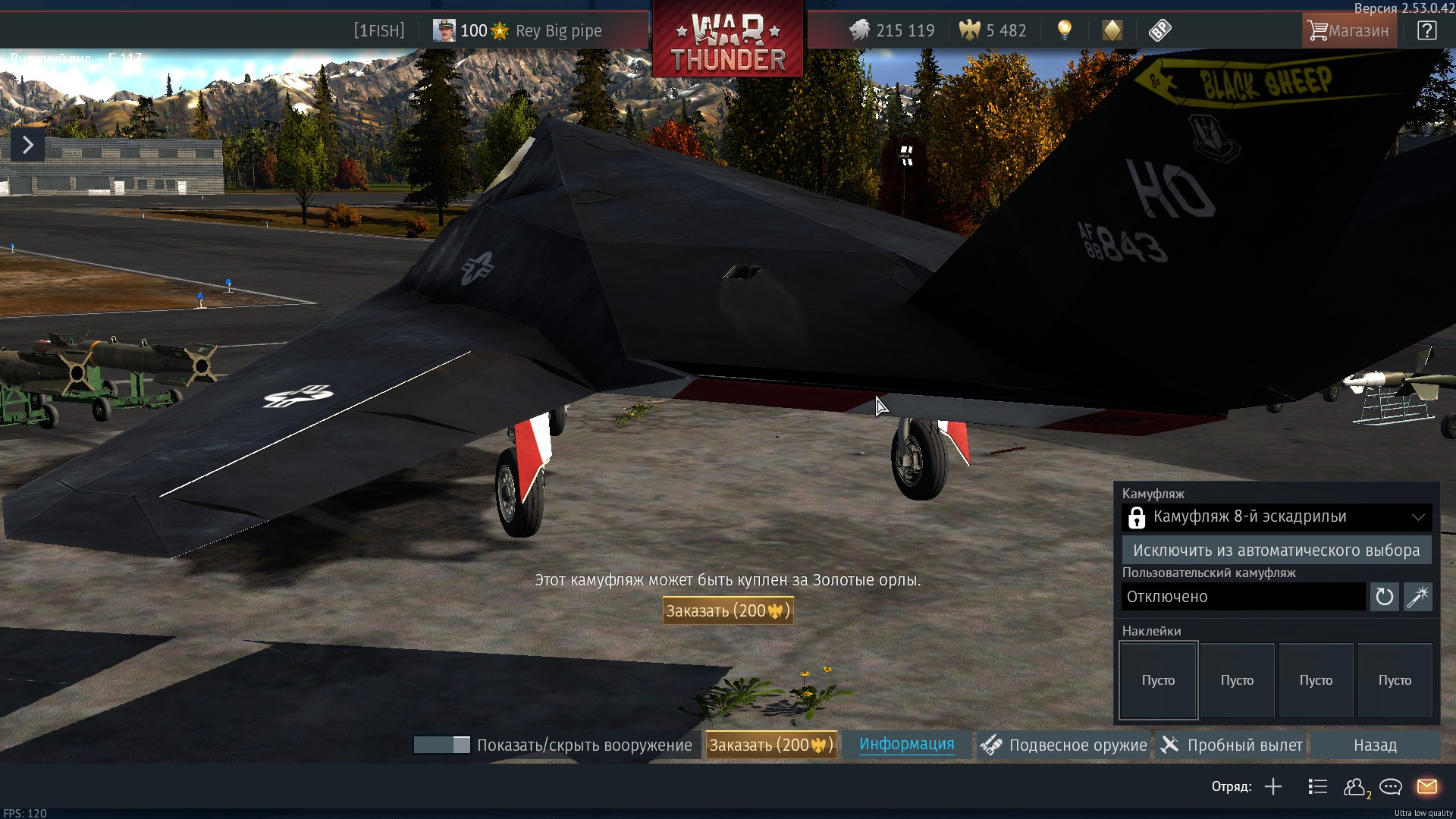 Начнем с «одёжки» (визуал): Прямо сразу бросаются в глаза «ляпы»: дефолтный черный камуфляж пестрит на хвосте красной надписью «Flying Knights», но с эмблемой на левом боку эскадрильи «Овцы». Зато с патриотичным (американским) флагом на всё пузо нам предлагается камуфляж с рисунком эскадрильи «Flying Knights», но с гордой надписью желтого цвета на хвосте, якобы названия эскадрильи - «Black Sheep»…
