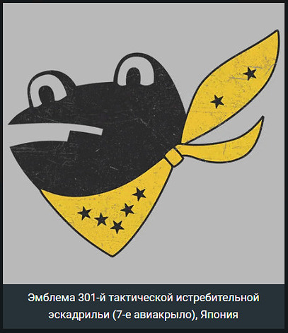 Хвостовой знак 301-й тактической истребительной эскадрильи ВВС Сил самообороны Японии (JASDF). Эскадрилья была сформирована предварительно 1 августа 1972 года и официально зачислена в состав 7-го авиакрыла 16 октября 1973 года. В качестве хвостовой эмблемы естественным образом утвердили лягушку. Она основана на одном из многочисленных видов лягушек, обитающих в районе авиабазы Хякури, а также несёт языковую игру, близкую пилотам: слово «лягушка» (蛙) произносится так же, как и «возвращаться» (帰る) — «каэру», поэтому лягушки стали символом удачи и благополучного возвращения. Семь звёзд на шарфе обозначают 7-е авиакрыло, хотя существуют варианты с меньшим числом звёзд, использовавшиеся, когда эскадрилья входила в состав других крыльев. Знак наносился на кили истребителей F-4EJ Phantom под диагональной полосой навигационных огней.
