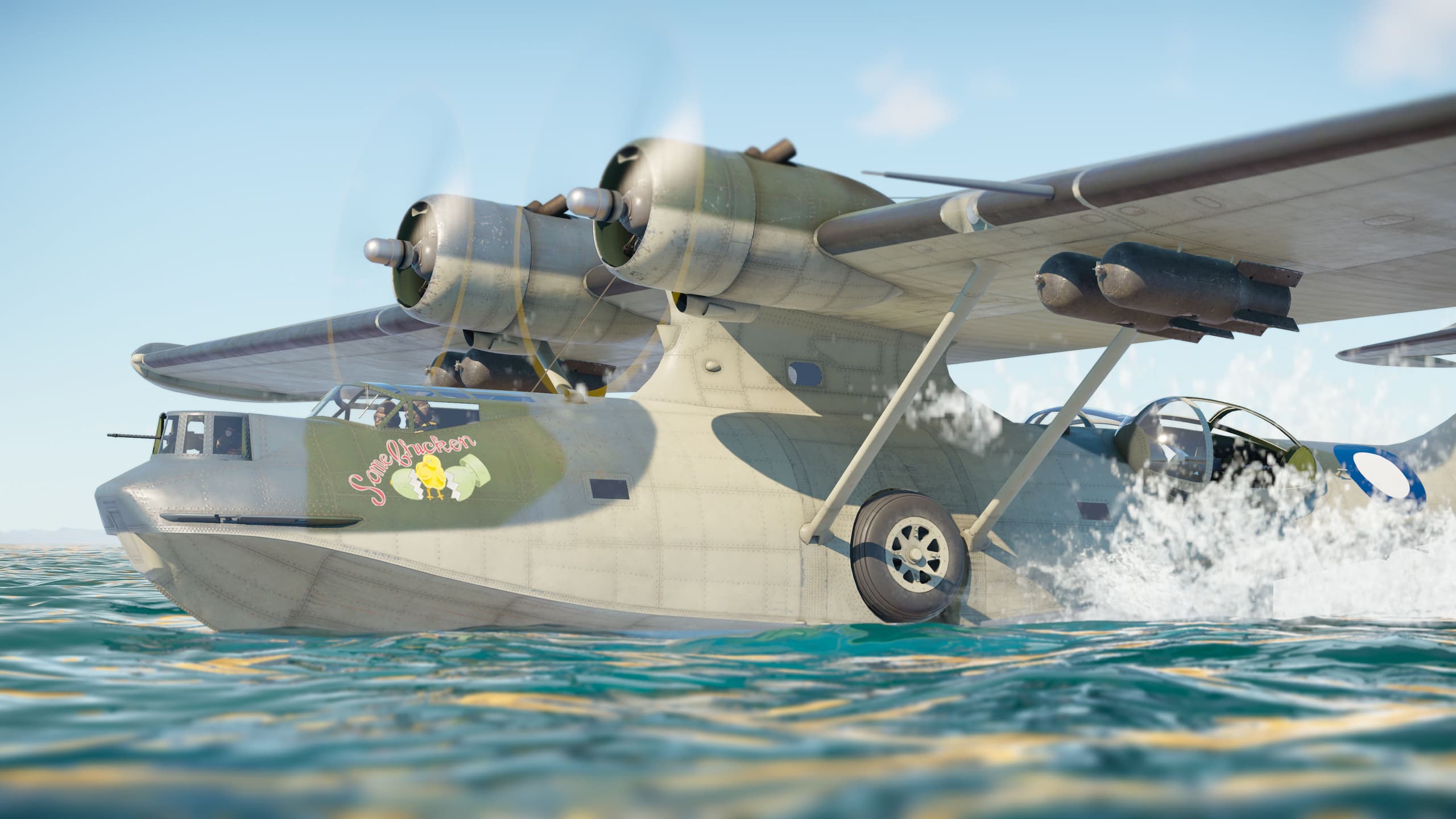 Рисунок «Some Chicken», 43-я эскадрилья Королевских ВВС Австралии. Эскадрилья была сформирована в Квинсленде, Австралия, 1 мая 1943 года. Она эксплуатировала исключительно PBY-5 Catalina и в основном выполняла задачи разведки, постановки мин и борьбы с надводными целями. Надпись восходит к цитате Уинстона Черчилля: после падения Франции в 1940 году один французский генерал заметил: «Через три недели Англии свернут шею, как курице». В декабре 1941 года, выступая в парламенте Канады, Черчилль парировал: «some chicken» («ещё какая курица»), имея в виду продолжающееся сопротивление стран Британского Содружества силам «Оси». Надпись была нанесена под передним окном на Catalina A24-65 OX-H. На спине цыплёнка, возможно, также был изображён заводной ключ, хотя фотодоказательства этого элемента трактуются по-разному.