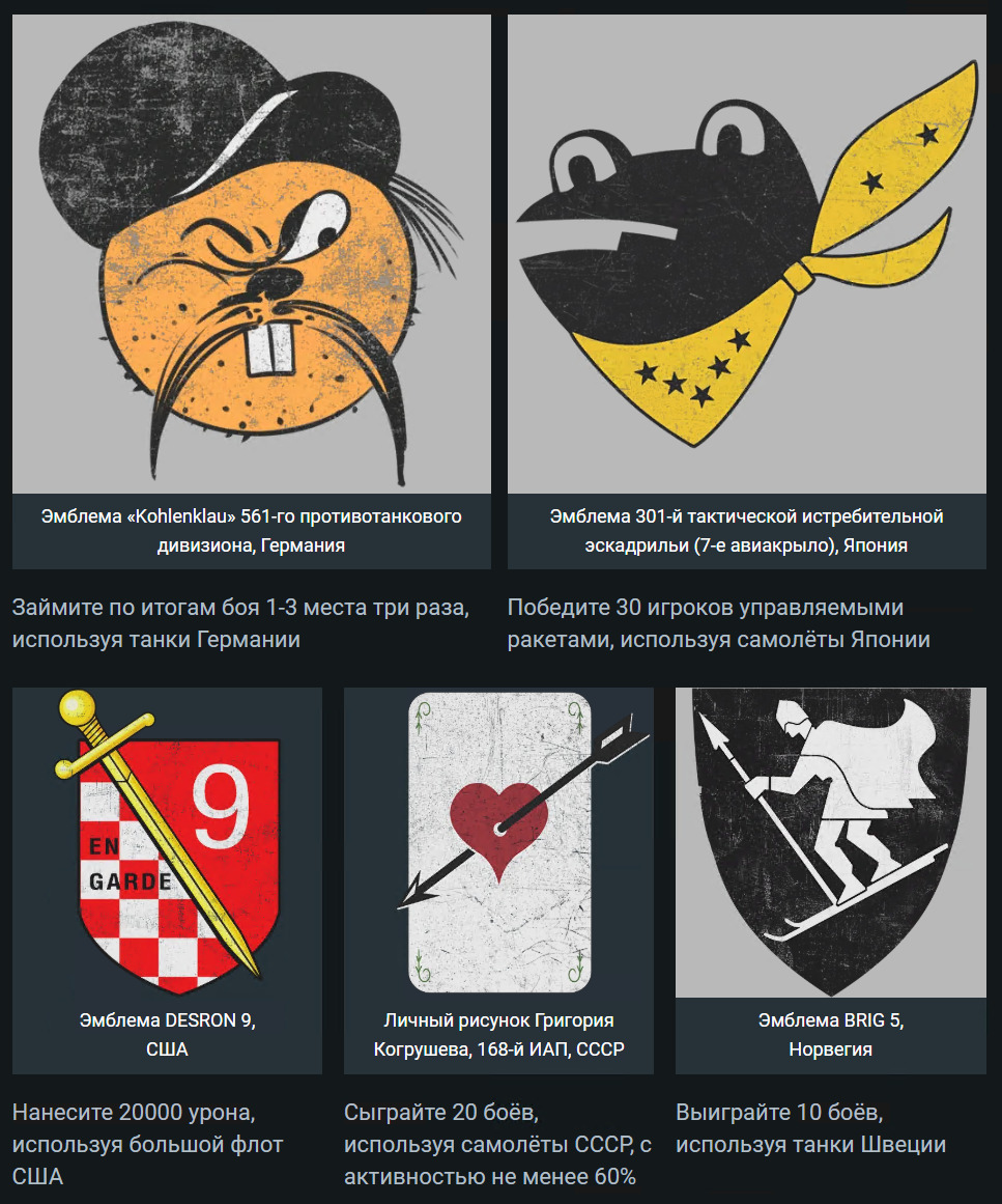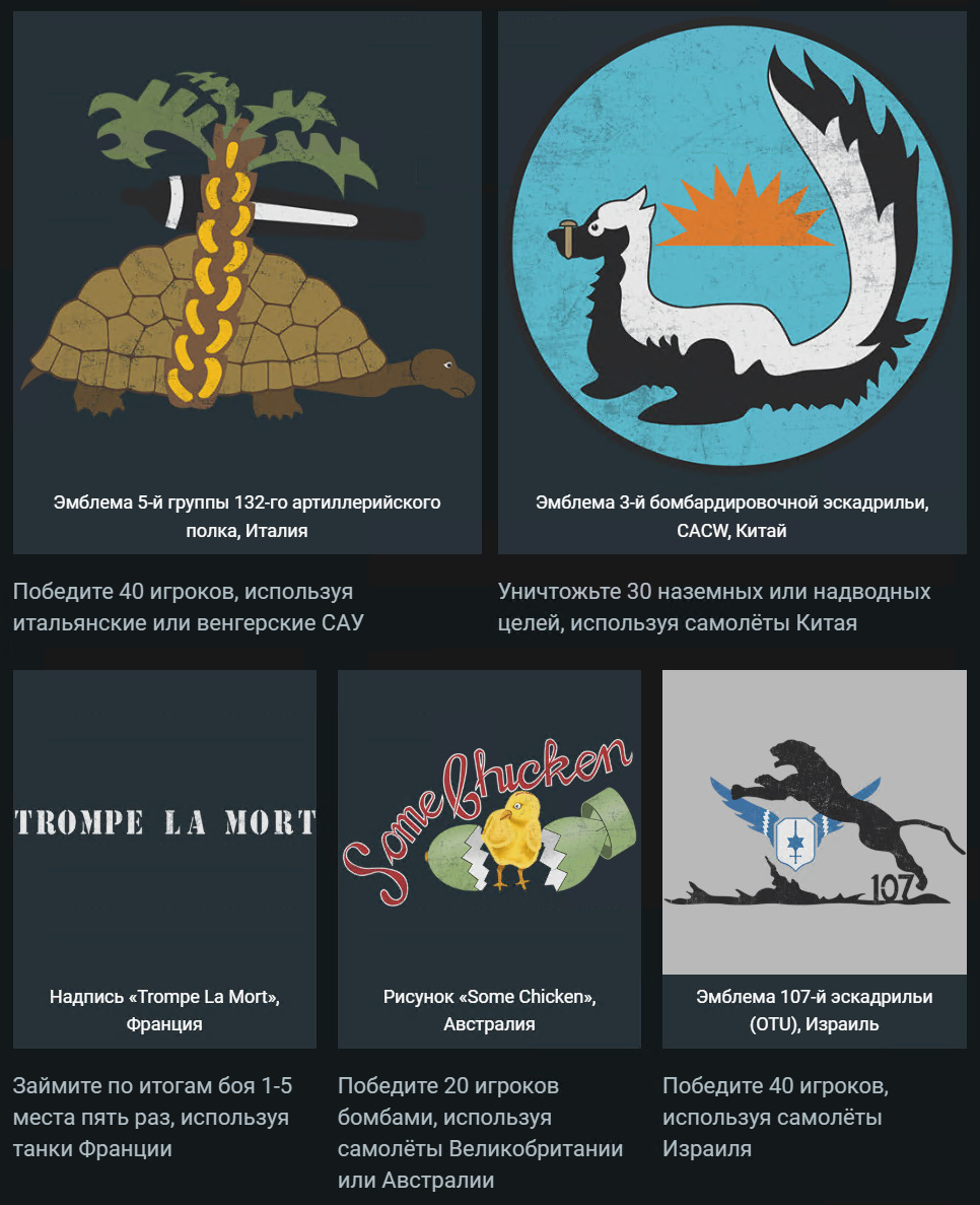 Надеемся, вам понравится февральская подборка! Нам полюбилась относительно редкая итальянская эмблема с черепахой, как и скунс из знаменитой эскадрильи, известной девизом «Spray and Pray». Мы также рады вернуть довольно уникальную немецкую эмблему «Kohlenklau». Для снятия скриншота мы поместили её на Marder III, но исторически её наносили на Marder II — то же самое относится и к Semovente, у нас в игре представлена более поздняя версия. Как всегда, оставляйте на форуме свои предложения по будущим декалям, и надеемся, что вам понравится!