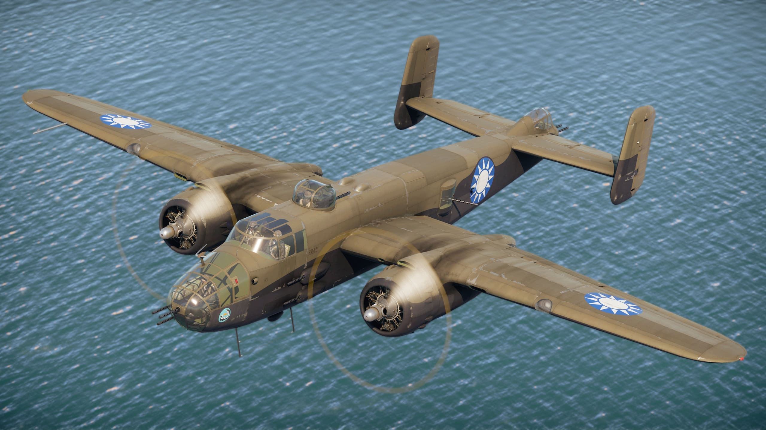 Эмблема 3-й бомбардировочной эскадрильи 1-й бомбардировочной группы Китайско-американского смешанного крыла (временного формирования). Появившаяся в феврале 1944 года 3-я эскадрилья стала последней бомбардировочной эскадрильей, сформированной во Второй мировой войне. Она находилась под совместным командованием майора Ли Сюэяня и полковника Джона А. Хилгера и показала впечатляющие боевые результаты за относительно короткий срок службы. Эмблему разработал Джон Хинричс-мл., офицер по снабжению эскадрильи. На ней изображён скунс на фоне восходящего солнца с прищепкой на носу, чтобы обезопасить себя от собственного «оружия». Эмблема произошла от девиза «Spray and Pray» («поливай и молись»), отражавшего задачи эскадрильи наносить атаки по японским позициям на тяжеловооружённых B-25. Эмблему часто рисовали по бортам носовой части самолёта, ближе к передней кромке.