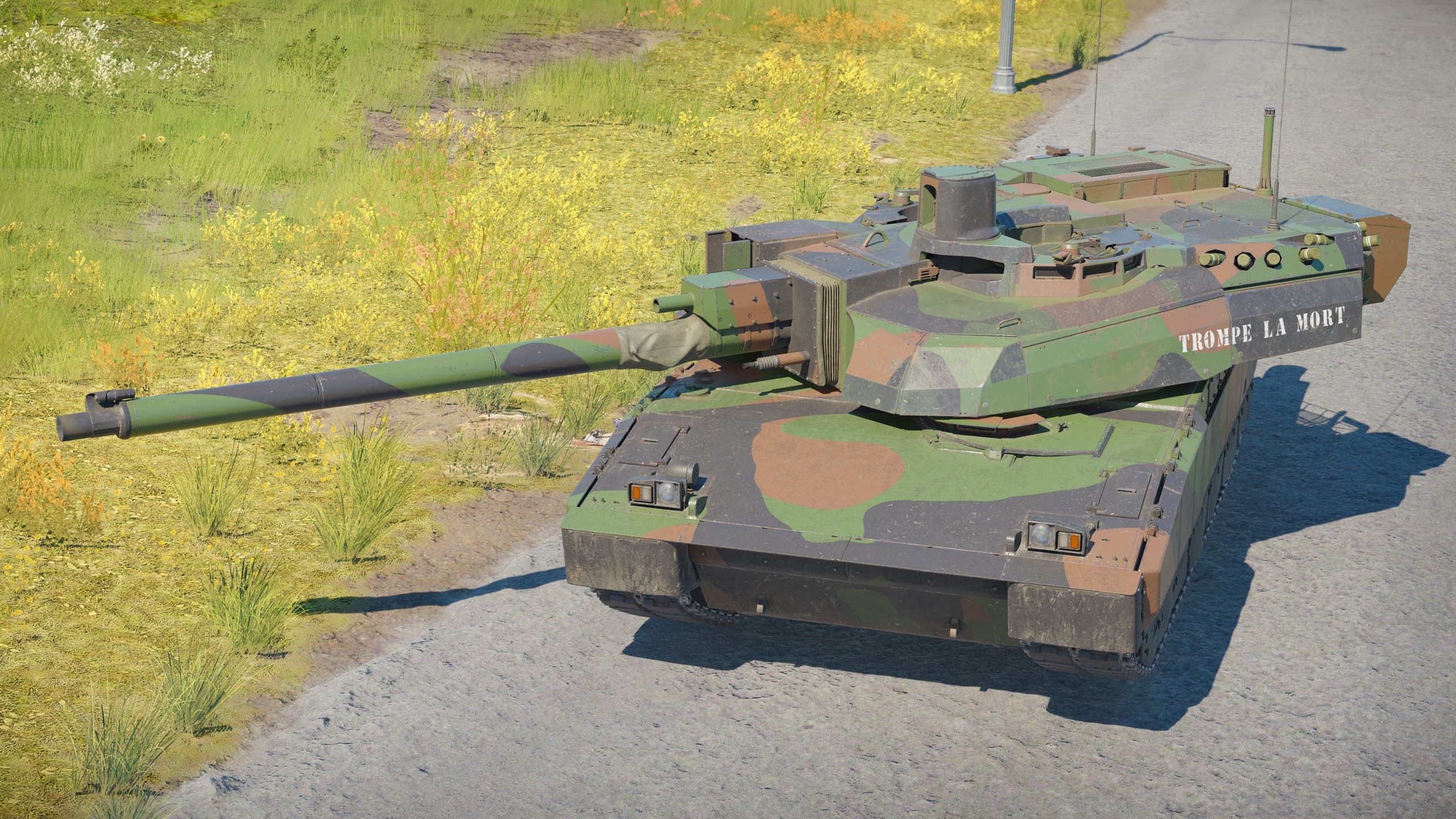 Надпись французской армии «Trompe La Mort». Это старофранцузское выражение, дословно «обмануть смерть»; в современном смысле ближе «сорвиголова». Популярности фразе во многом добавил роман Оноре де Бальзака «Отец Горио» (1835), где она используется как прозвище одного из персонажей. У неё есть и «военная» история: впервые надпись появилась на бронемашине Schneider CA1 в Первую мировую войну. Впоследствии она послужила прямым источником вдохновения и для более современных танков французской армии. Данный трафаретный вариант был нанесён на борта башни ОБТ Leclerc ближе к корме.