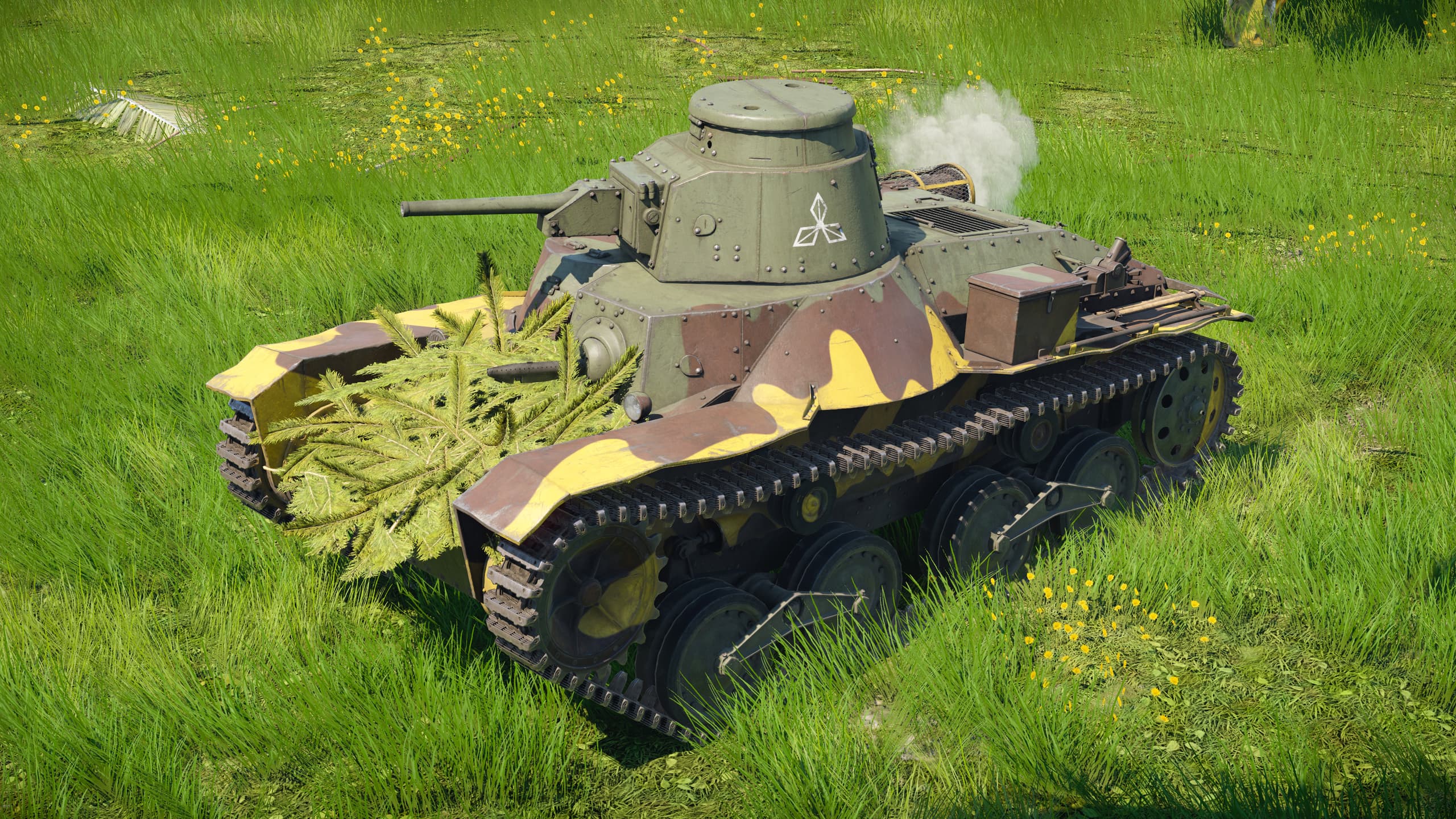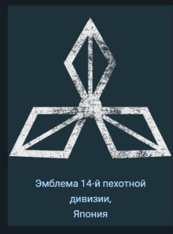 Эмблема 14‑й пехотной дивизии Императорской армии Японии. Знак дивизии явно напоминает логотип Mitsubishi, и хотя существуют косвенные доводы в пользу того, что сходство было намеренным, убедительных доказательств немного. 14‑я дивизия использовала танки Ha‑Go производства Mitsubishi, а в 1940‑е логотип компании нередко изображали в более ромбовидной форме, близкой к эмблеме дивизии. Возможно, это и визуальная отсылка к условному наименованию соединения «照兵団» («Сияющая дивизия»): эмблема призвана имитировать лучи света. В поздние годы войны подобные знаки часто были менее стандартизированы и более неформальны, поэтому с уверенностью трактовать их сложно. Эмблему наносили на борта башни танков Ha‑Go этой дивизии во время её развёртывания на Пелелиу в 1944 году.
