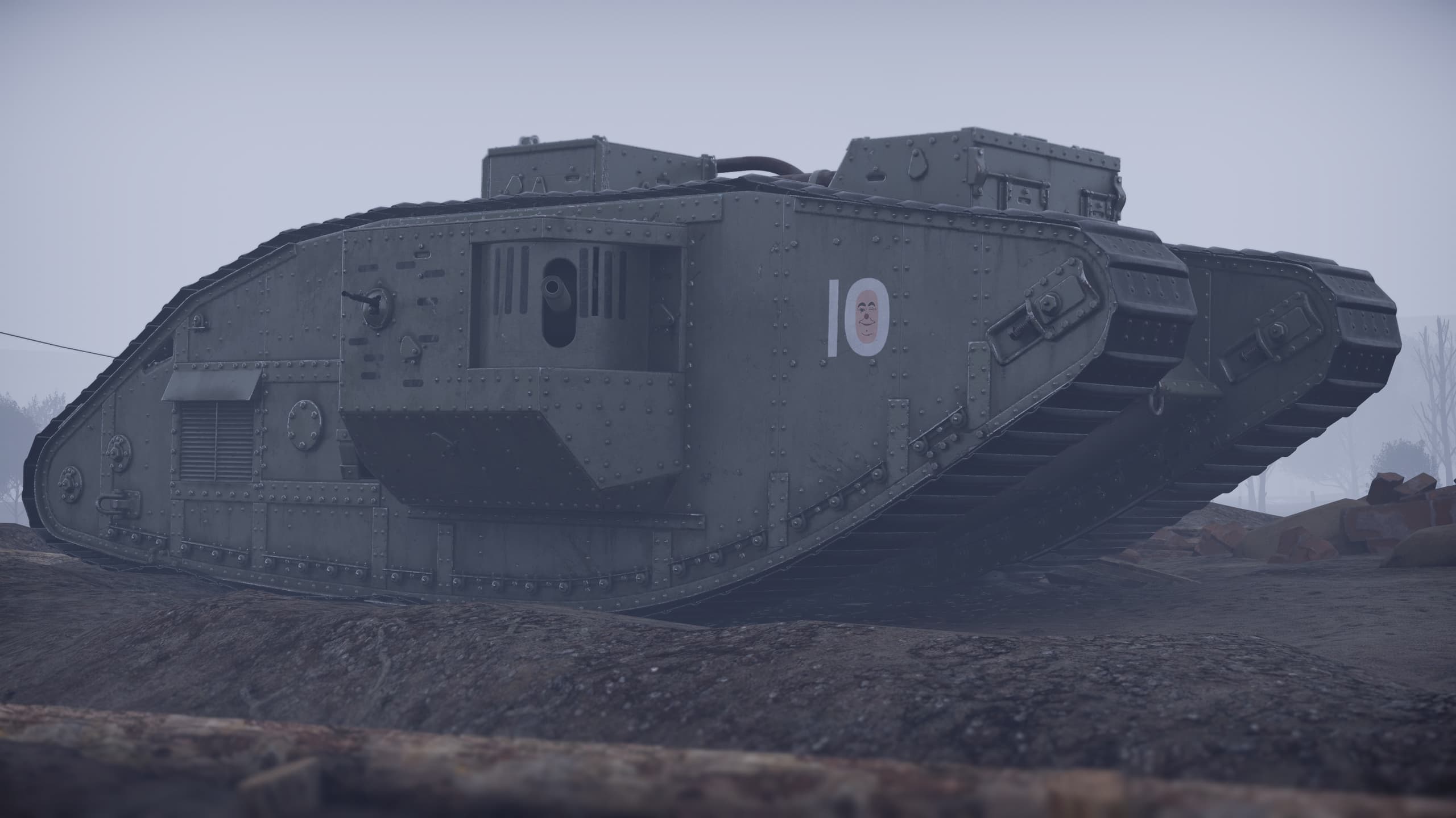 Эмблема «Подмигивающий клоун», батальон F, 16-я рота, 2-е отделение, Танковый корпус Британии. Эта несколько пугающая эмблема принадлежала британскому танку «женского типа» с серийным номером 2716, которым командовал младший лейтенант Сеймур. Подробностей о службе танка и его экипаже известно немного; источники расходятся даже в отношении имени командира. Следы машины теряются после Третьей битвы при Ипре 31 июля 1917 года: дальнейших упоминаний нет, в журналах эвакуации она также не фигурирует, что позволяет с большой долей уверенности предположить её потерю в том сражении. Происхождение самой эмблемы тоже остаётся загадкой: возможно, она основана на образе французского клоуна Пьеро, поскольку прозвище танка — «Feu d’enfer» («Адский огонь») — тоже было французским. Знак наносили на борт корпуса с правого борта под кабиной механика-водителя, рядом с литерой батальона F, стоявшей перед числом 10.