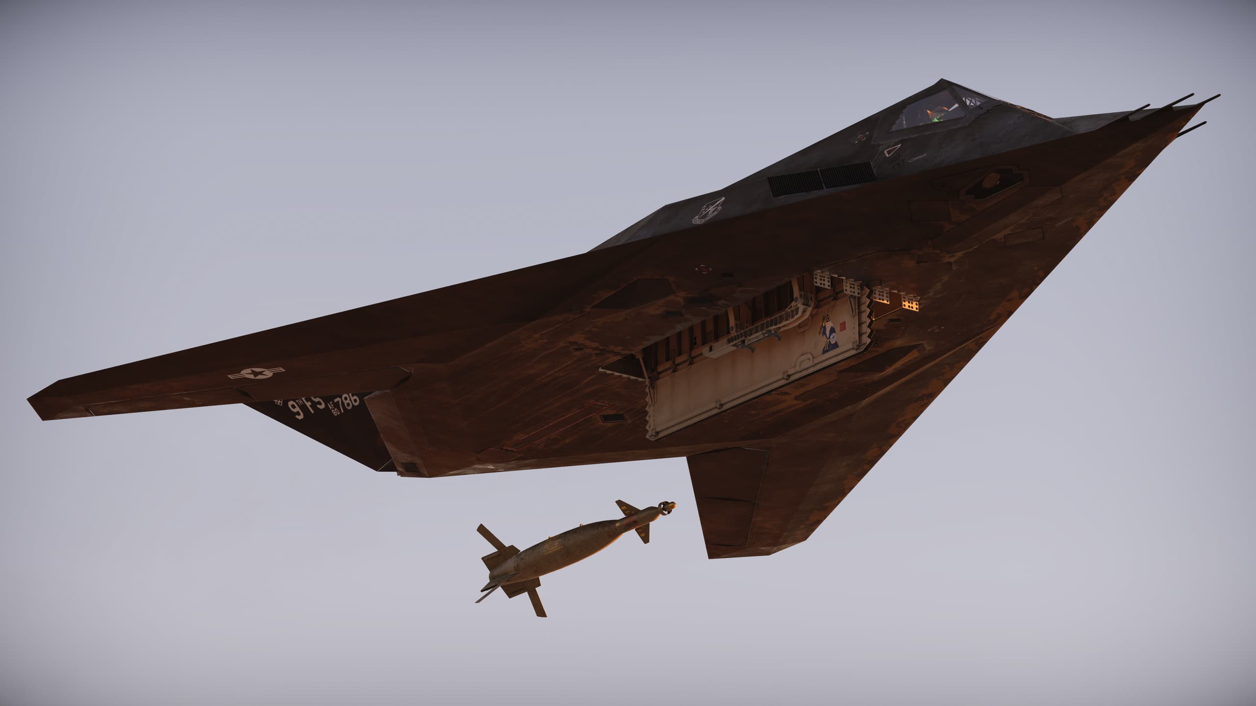Рисунок «Волшебник GBU», 416-я тактическая истребительная эскадрилья ВВС США. Следуя укоренившейся в ВВС традиции персональной носовой росписи, пилотам F-117 во время войны в Персидском заливе приходилось проявлять тактическую осторожность не только в применении самолёта, но и в выборе маркировок. Поскольку самолёты были покрыты специальной радиопоглощающей краской (RAM), личные маркировки на внешней поверхности запрещались, чтобы не ухудшить радиопоглощающие свойства покрытия. Не смутившись этим ограничением, пилоты стали наносить персональные рисунки внутри самолёта — на внутренних дверях бомбоотсека. Большинство изображений обыгрывало «мистическую» природу F-117; нередко встречались мотивы магии и колдовства. Этот рисунок был нанесён по кромке внутренней двери бомбоотсека на F-117 с бортовым номером 81-10797; справа от него располагалась сопроводительная надпись «Spell Bound» (игра слов: «spellbound» означает «заколдованный», а в таком написании и контексте — «наводящийся магией»).