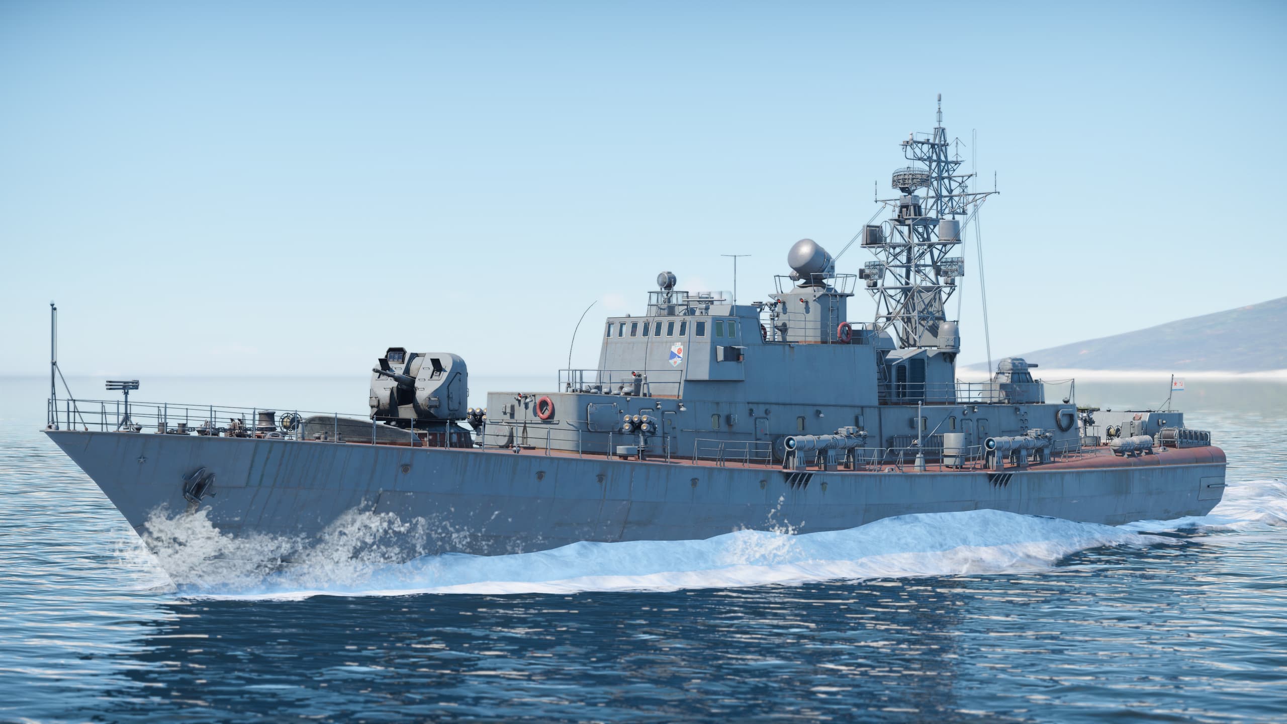 Эмблема малых противолодочных кораблей бригады охраны водного района ВМФ СССР. В начале 1970-х годов была создана специальная комиссия для разработки корабельных эмблем для отдельных классов и родов службы флота. Руководителем группы художников был Валентин Печатин, к 1972 году он создал большинство эмблем. Каждый элемент основы-щита был продуман: пять выступов щита символизируют четыре основных флота и Каспийскую флотилию. Синий треугольник и белые полосы внизу отсылают к матросскому воротнику. Ракета в луке была стандартным элементом подобных эмблем, но на некоторые корабли вместо неё наносили герб города. Размещение эмблемы немного различалось: её часто наносили на лобовую часть мостика под крайним правым окном, на борта мостика или рядом с радиорубкой.