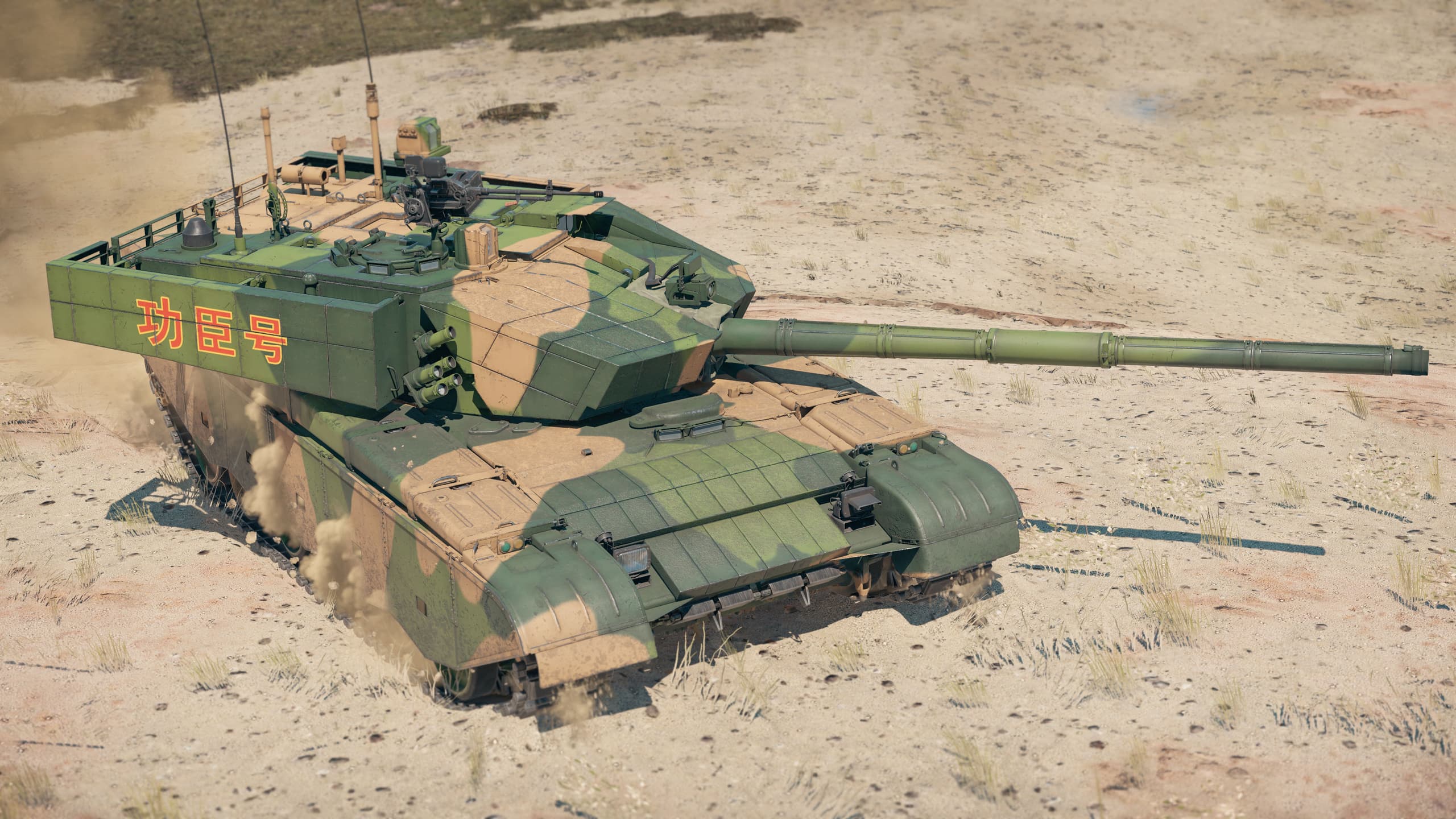 Надпись «Заслуженный воин V» (功臣号), НОАК. Традиция называть танк «Заслуженный воин» (упрощённо — «танк-герой») восходит к первому танку НОАК — трофейному Chi-Ha Kai. Этот танк блестяще проявил себя в бою и получил это прозвище, закрепив свой легендарный статус. В каждом поколении отбираются новая машина и экипаж, которым передают это имя, — в честь наследия и истории НОАК и как мощный символ гордости. Экипажи соревнуются за право носить это звание, и честь достаётся лишь лучшим из лучших. Хотя у каждого варианта знака нет официального названия, его обычно называют по поколению танка, на котором он изображён. Конкретно этот знак был нанесён в 2018 году на борт башни ZTZ99A, на блоки динамической защиты.