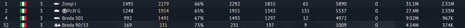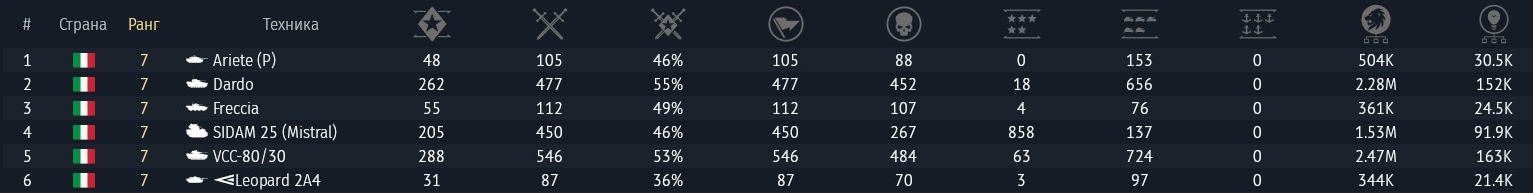 Пример 10.7 Италии, которую недавно начал качать. Порядок выезда: Freccia -> Ariete (P) -> Leopard 2A4 + статистика по предыдущему сетапу из Dardo -> VCC-80/30 -> SIDAM 25 (Mistral)