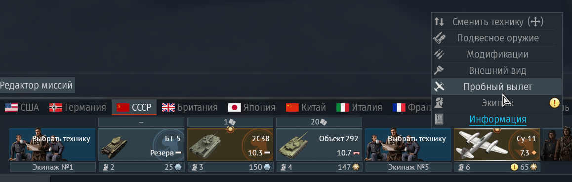 - В окне прокачке модификаций любого самолета должна быть кнопка для запуска такой миссии (по аналогии с испытанием вооружения)