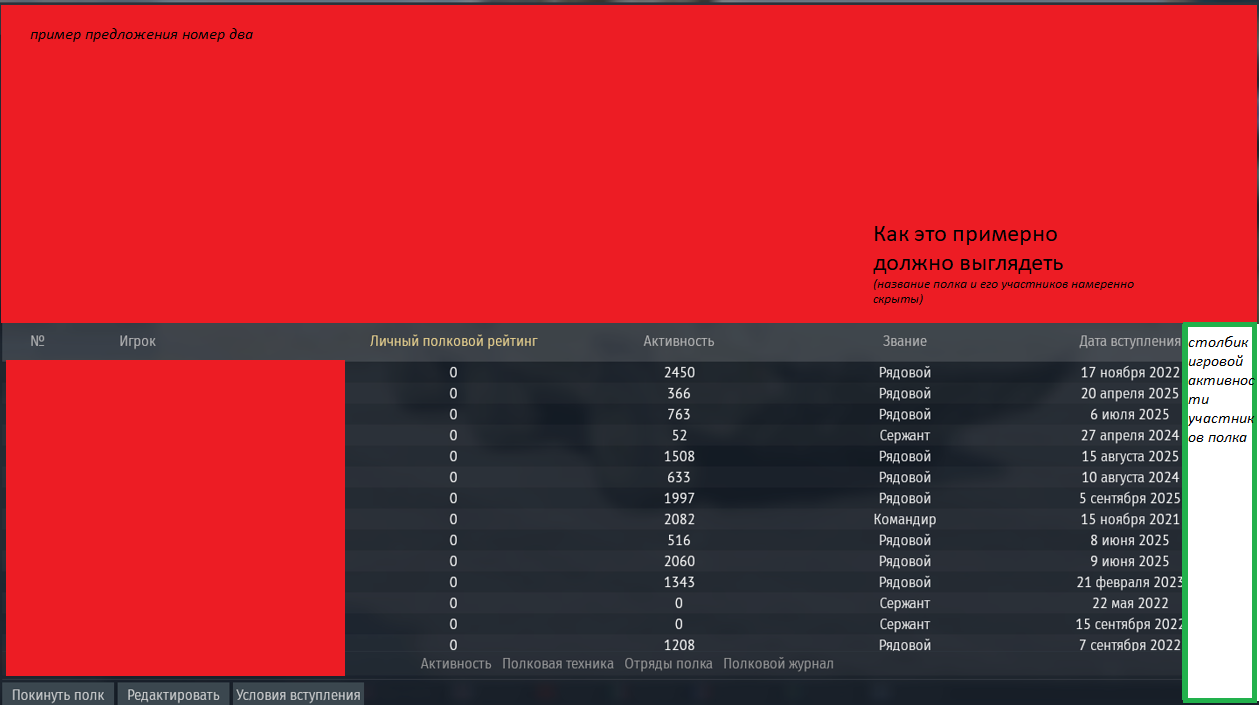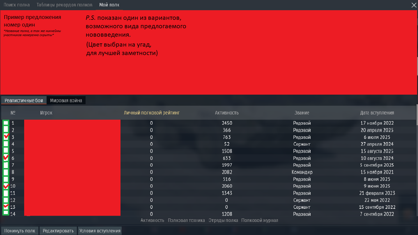 Второе предложение - добавить таймер игровой активности игрока, который показывает когда игрок был последний раз в сети, рядом или в отдельный столбик с датой вступления в полк.