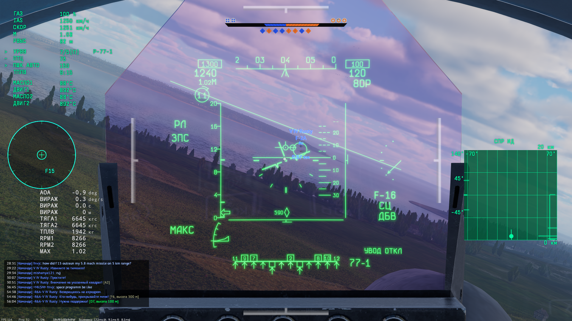 летит самолёт, на радаре у меня не отображался, захватываю через бвб нсц, пишет что ф16