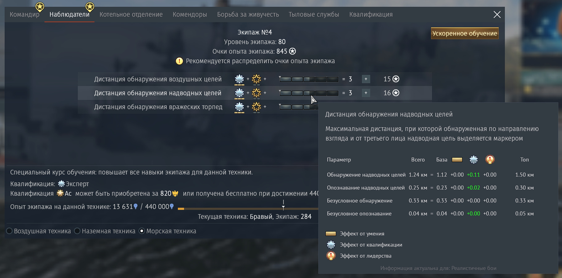 В таблице логично и понятно показано на что и на сколько влияют различные вложения в экипаж. Безусловное обнаружение получило от экспертов 0 потому, что оно БЕЗУСЛОВНО! Никакие условия на дистанцию безусловного обнаружения не влияют, ни направление взгляда, ни прокачка экипажа, вообще ничего не влияет. Это тебе в таблице и показано.