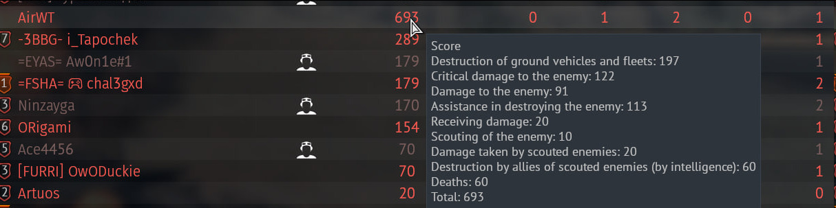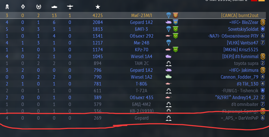 Однажды вертолетчик сделал больше 1 фрага ради вылета на птурах. На следующий день у него отвалилась жопа (тот его единственный фраг в табе - я)