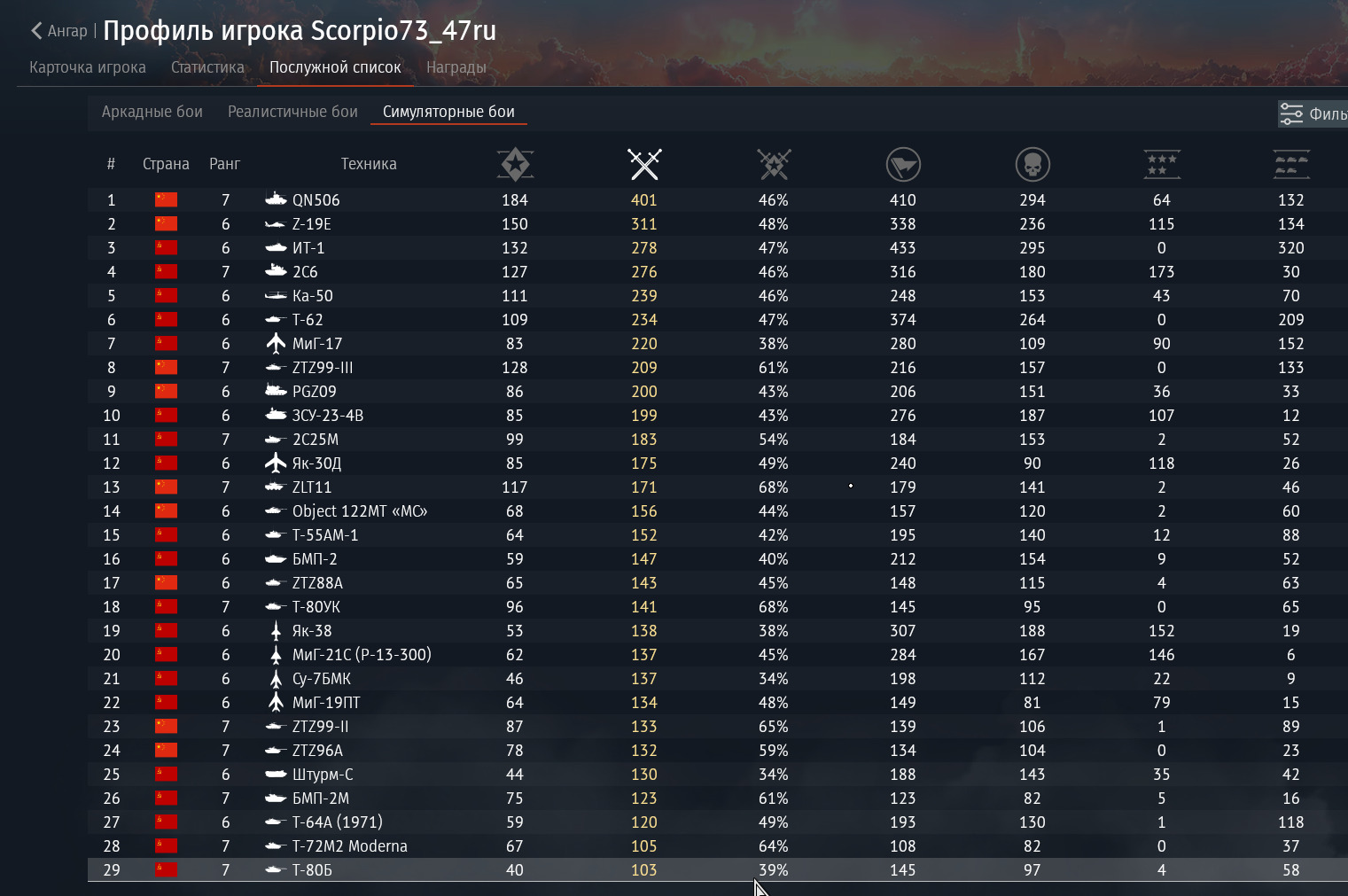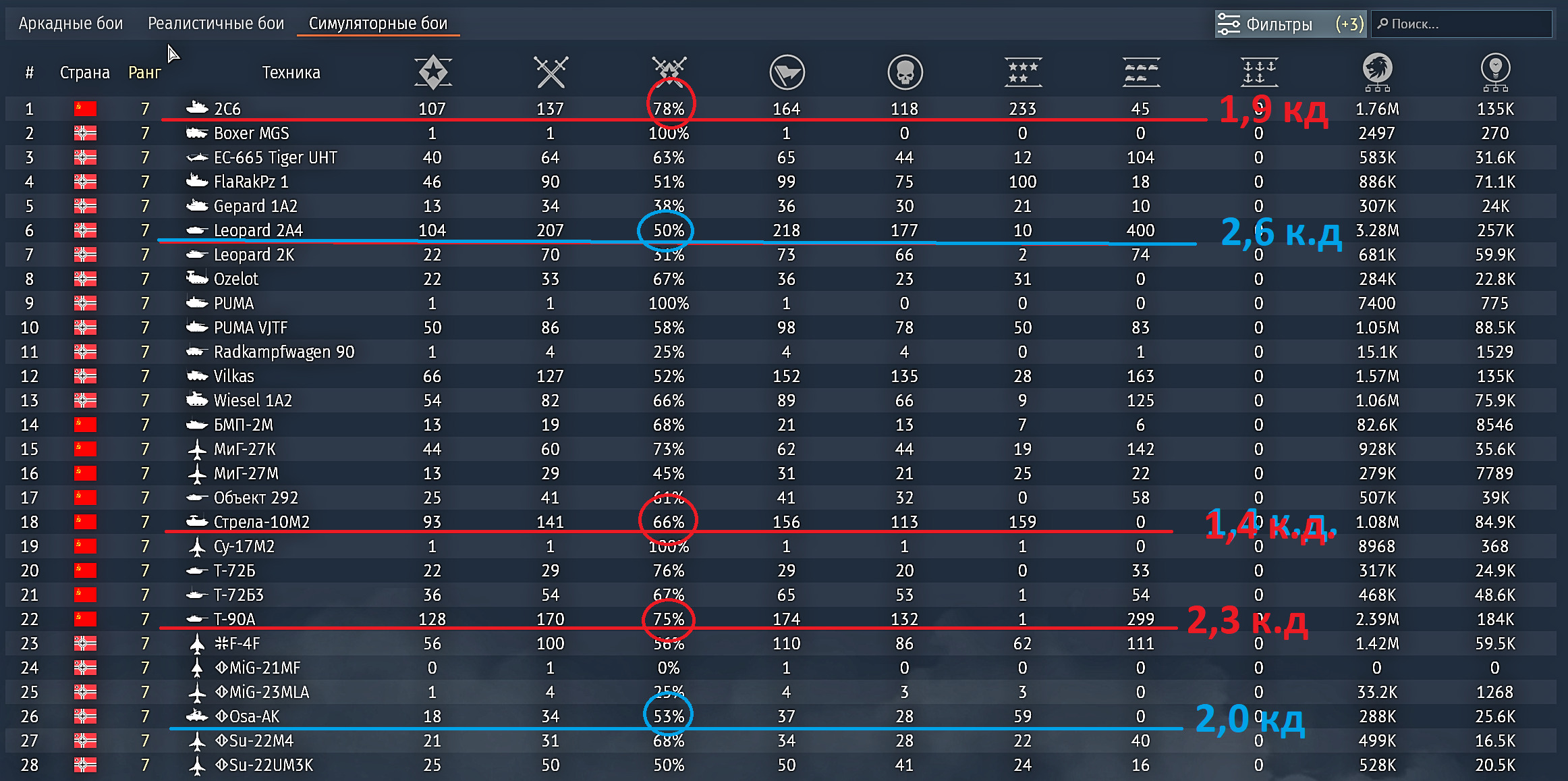 Как и в примере выше, на основном красном танке винрейт выше 70%, на основном синем танке (2а4), который я считаю лучше т-90, винрейт около 50, ПРИ ЭТОМ кд на синем танке БОЛЬШЕ чем кд на красном. А винрейт ниже. Точно такая же ситуация с зенитками. КД по воздуху на синей зенитке лучше, винрейт на дне.