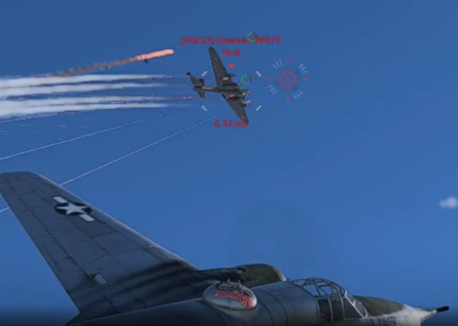 Вот приложил старый клип где я втаранился в 3.6 кб статиста на метеоре после прострела. Если смотреть на 0.25 можно отчетливо увидеть возле прицела появление черточек которые являются индикатором того, что ты попал во что-то своими пушками или пулеметами. При этом эти черточки появляются даже если ты попал в противника, который уже выпрыгнул из самолета.