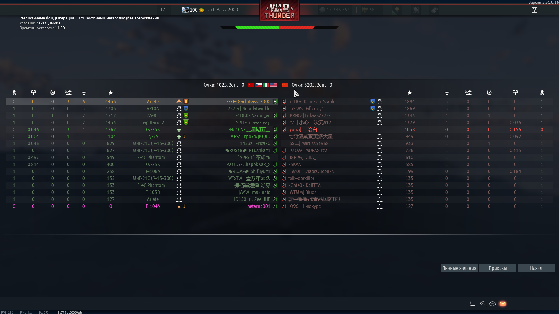 Очень интересно Улитки сделали механику флагов для стран. Если условно в одной команде играли самолёты Германии и Израиля, но при этом в команде не осталось в живых ни одного самолёта Германии, то в ТАБе будет отображаться только Израиль, а если наоборот - то только Германия, вот из всей той солянки что воевала против меня из живых остался чел на китайском Q-5, а в табе был только флаг китая
