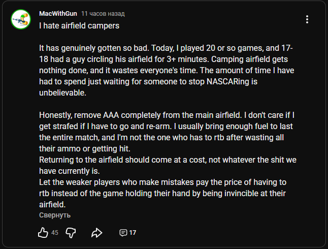 А если честно если и отменять ПВО на главном филде то нужна компенсация,может в виде точки пополнения боеприпасов в воздухе над аэродроме.А если сохранять ПВО то можно дать зону вокруг филда,при нахождении в которой допустим 90 секунд начнется утекание очков.Филд с защитой должны быть хотя бы для возможности безопасного ремонта.