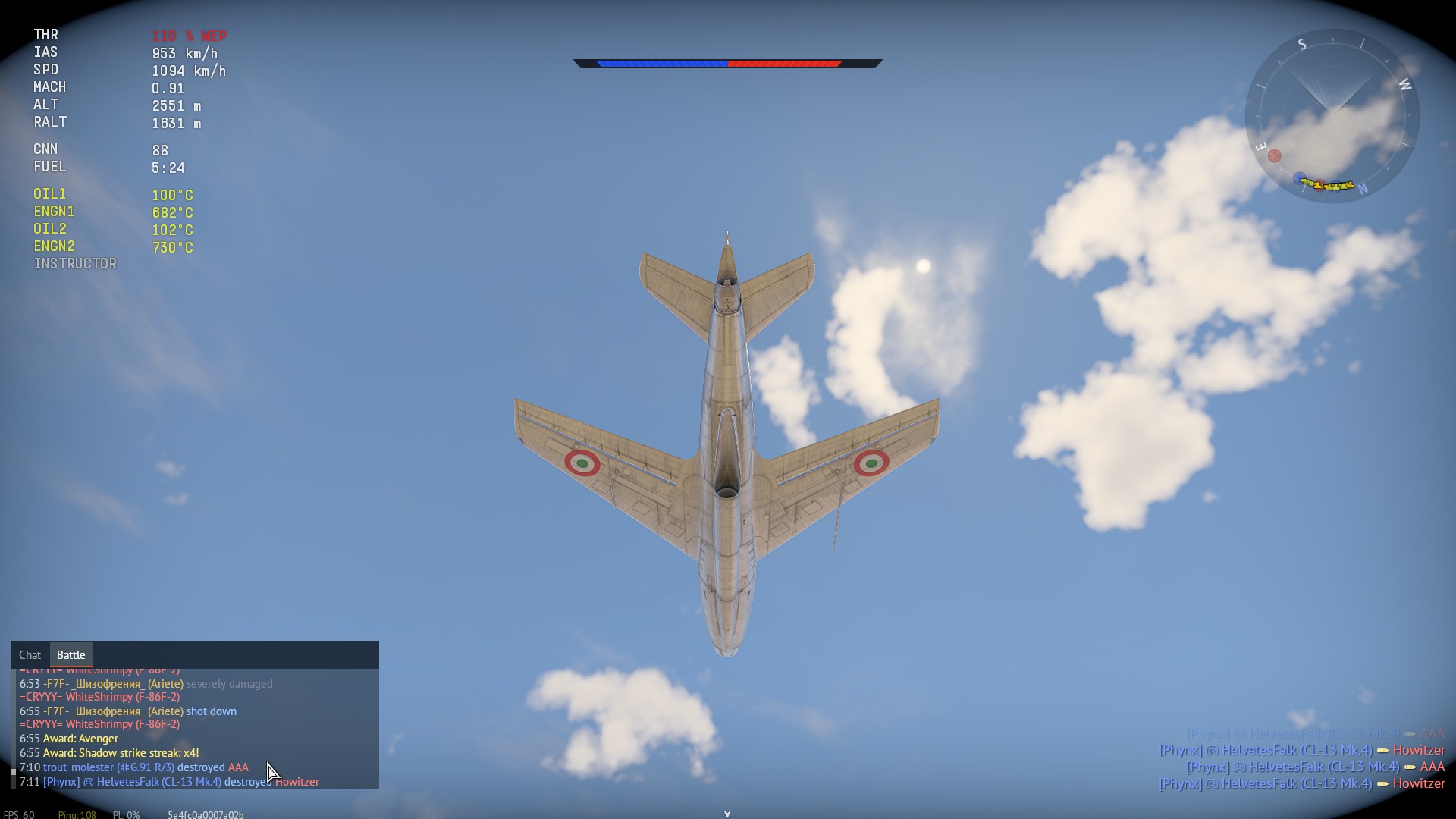 Еще из недостатков самолета обнаружил РНку, которая когда самолет накренился на 90 градусов не позволяет делать прострелы, нос зачастую ныряет, можно даже по Ф-100Д два раза подряд из-за этого падения носа не попасть