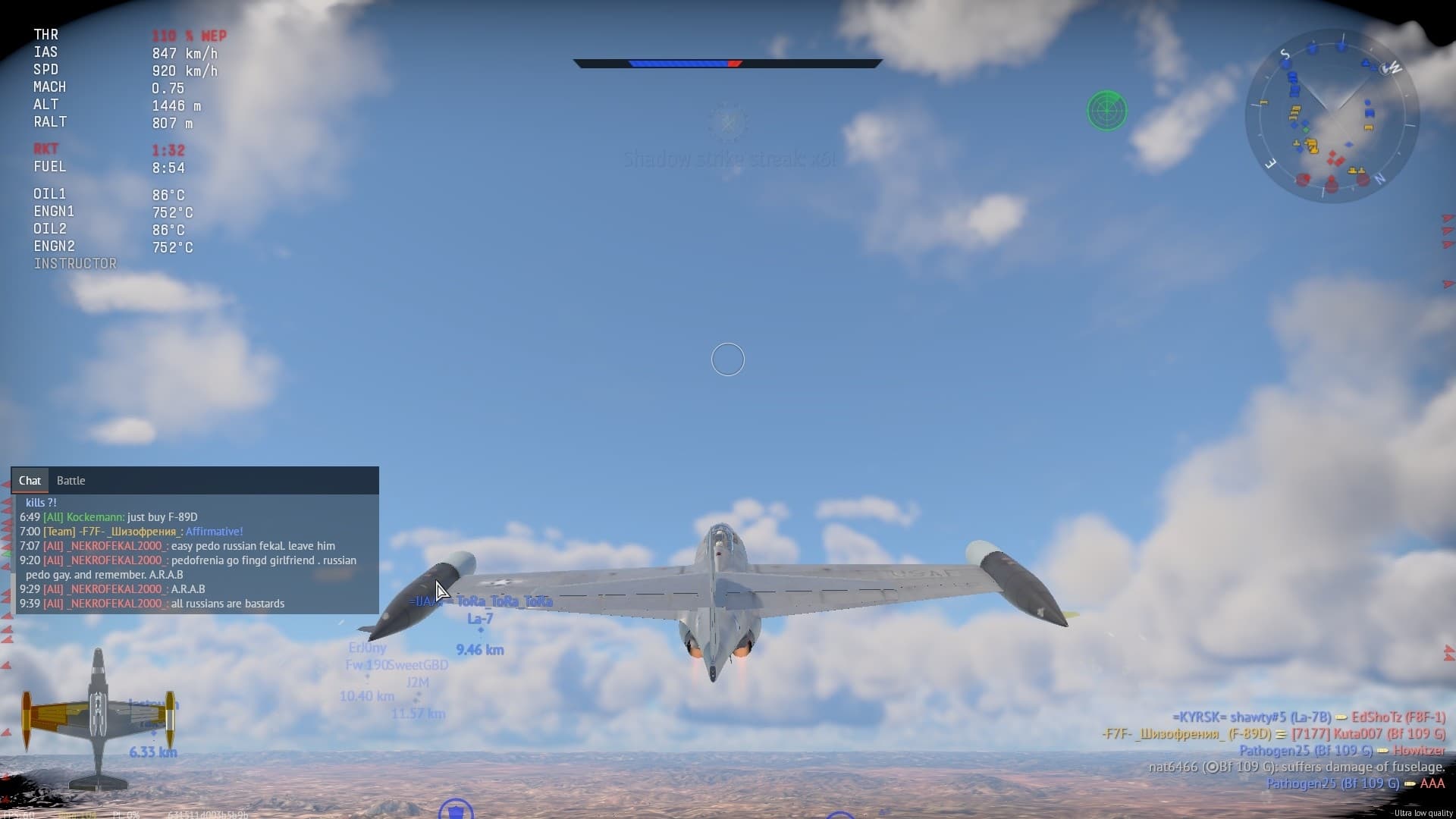 Мда. Ф-4 как не игрался без подвесов, так и не играется этот кал без подвесов. При этом дамаг с пяти стволов хуже одного швака, лтх уровня мусорного бака. Любого бомжа на яке и даже дристанге три часа надо крутить - за это время уже десять раз убить могут. Пожилой бум-зум доджит любой инвалид.