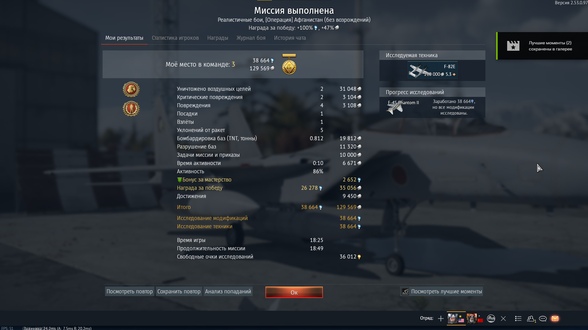 Но тут выпал СБ афган, народ вроде по своим делам полетел, базки даже не все сразу сожрали. Приятно было другое: первым фрагом был британский прем хорнет, которого 7ф не теряла все 20 +/- км. Пытался еще гоняться за миражем с пусками 9н, но там без вариантов, более менее грамотные лтц зарешали, пока я надеялся, что 9н их хоть раз не увидит… А в конце союзный су33 впилился в гору, вражий еще один бритохорнет убился об пво, бритофантом тоже разбился, остался только ф15, который свою 7м пустил слишком поздно… Бой чистое везение, так у меня на фантоме дай боже выходит один килл…