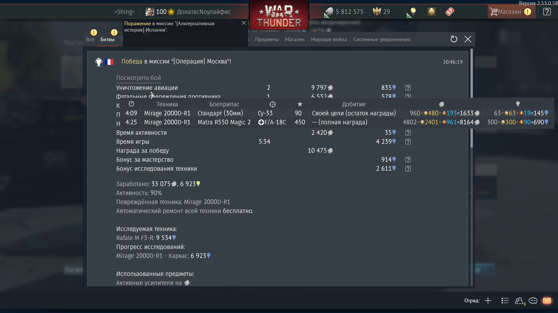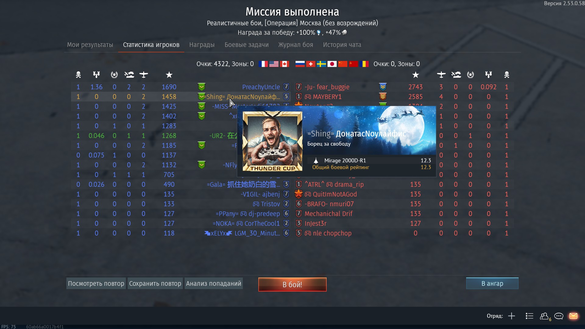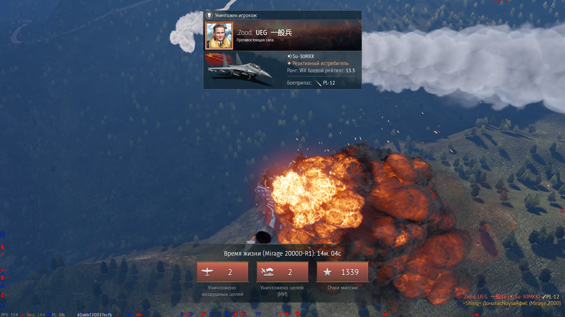 Четвёртый бой - не вывез дуэли с китаелётом, бывает. ЛТХ, напоминаю, у меня стоковые, с ними этот Мираж лучше летает, чем премиумный Ф1, но против Су-30 этого всё равно мало, слишком медленно разворачивается.