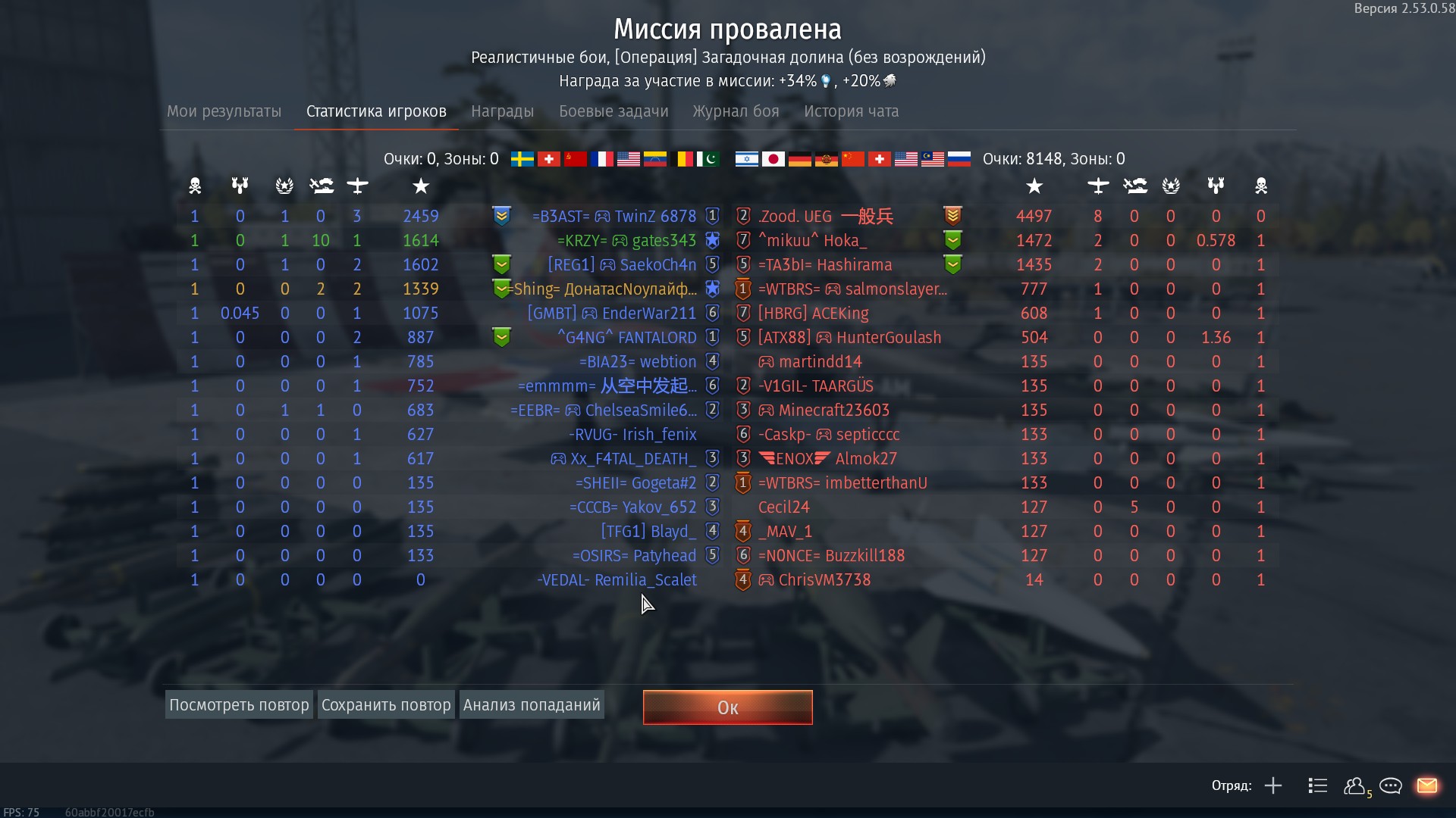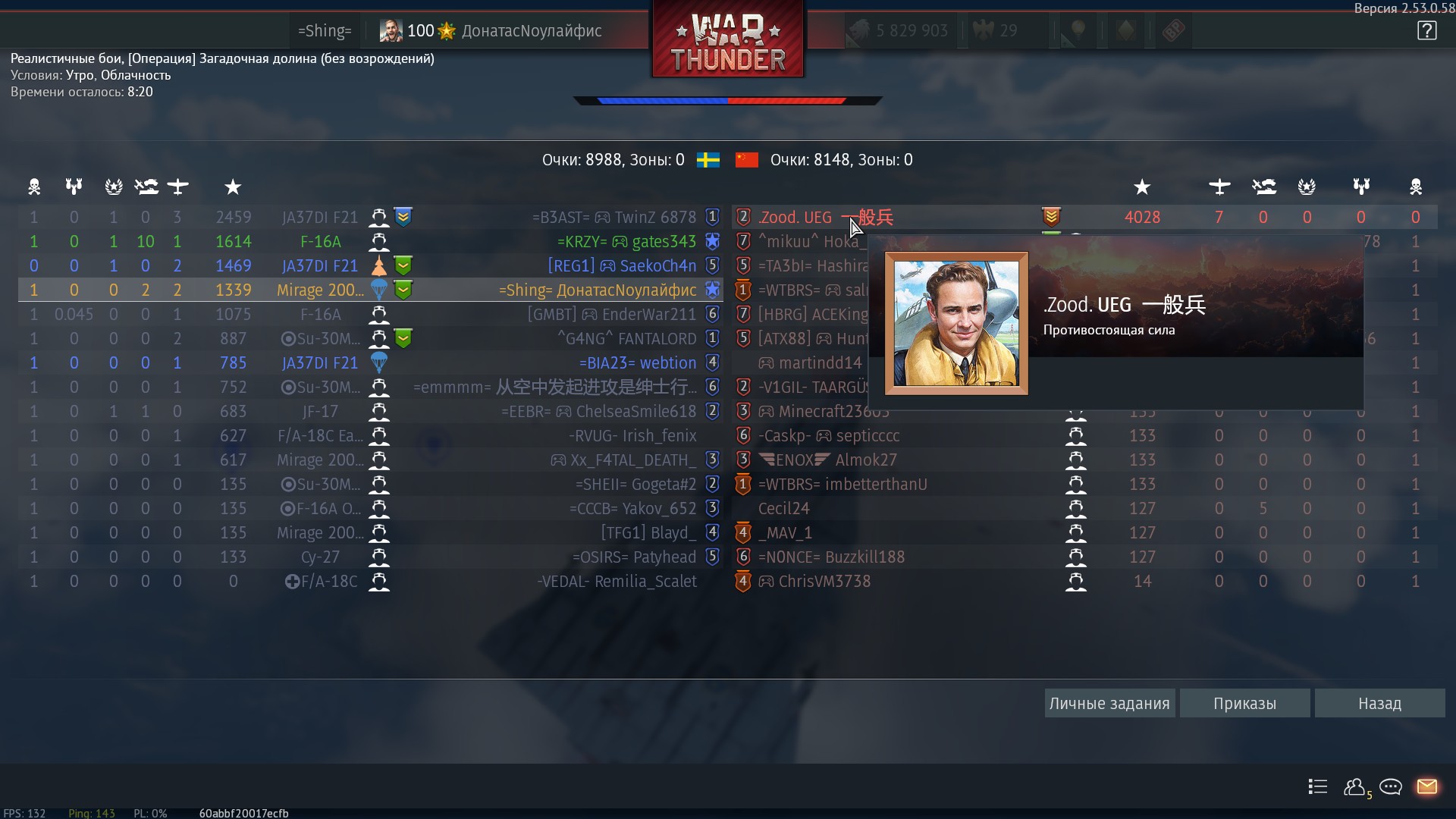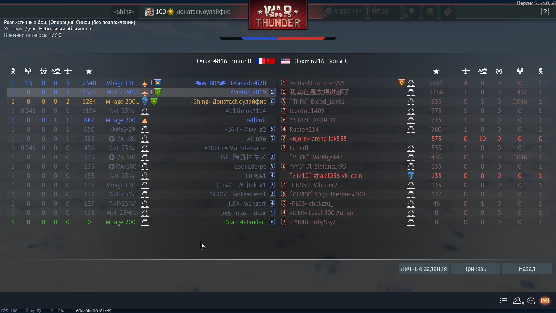 Четвёртый бой - не вывез дуэли с китаелётом, бывает. ЛТХ, напоминаю, у меня стоковые, с ними этот Мираж лучше летает, чем премиумный Ф1, но против Су-30 этого всё равно мало, слишком медленно разворачивается.