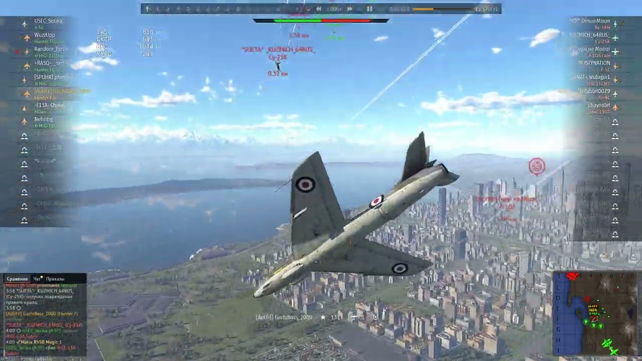 Вот кстати фрагмент одного из моих боёв на Хантере если интересно. Мне даже жалко стало бИдного МиГа-19, которым я защитился от всеракурсной ракеты бич-пакетной Сушки