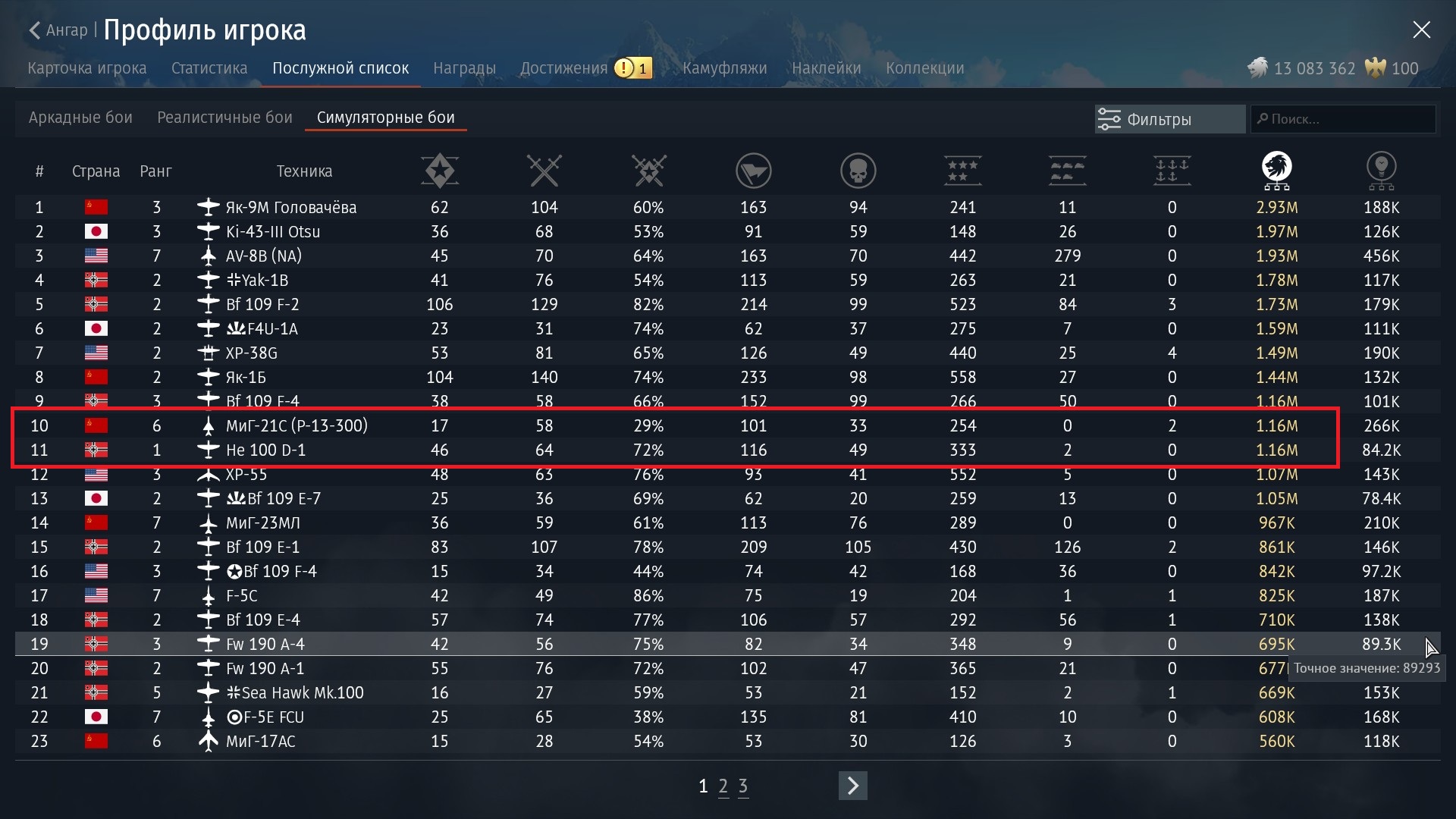 Сompadres, про доходность в серебре. Случайно отсортировал свои самолеты по сере и обратил внимание. На сотке я играл в древние времена и без према, а на 21 с осени 23 и с премом. Количество боев примерно равное.