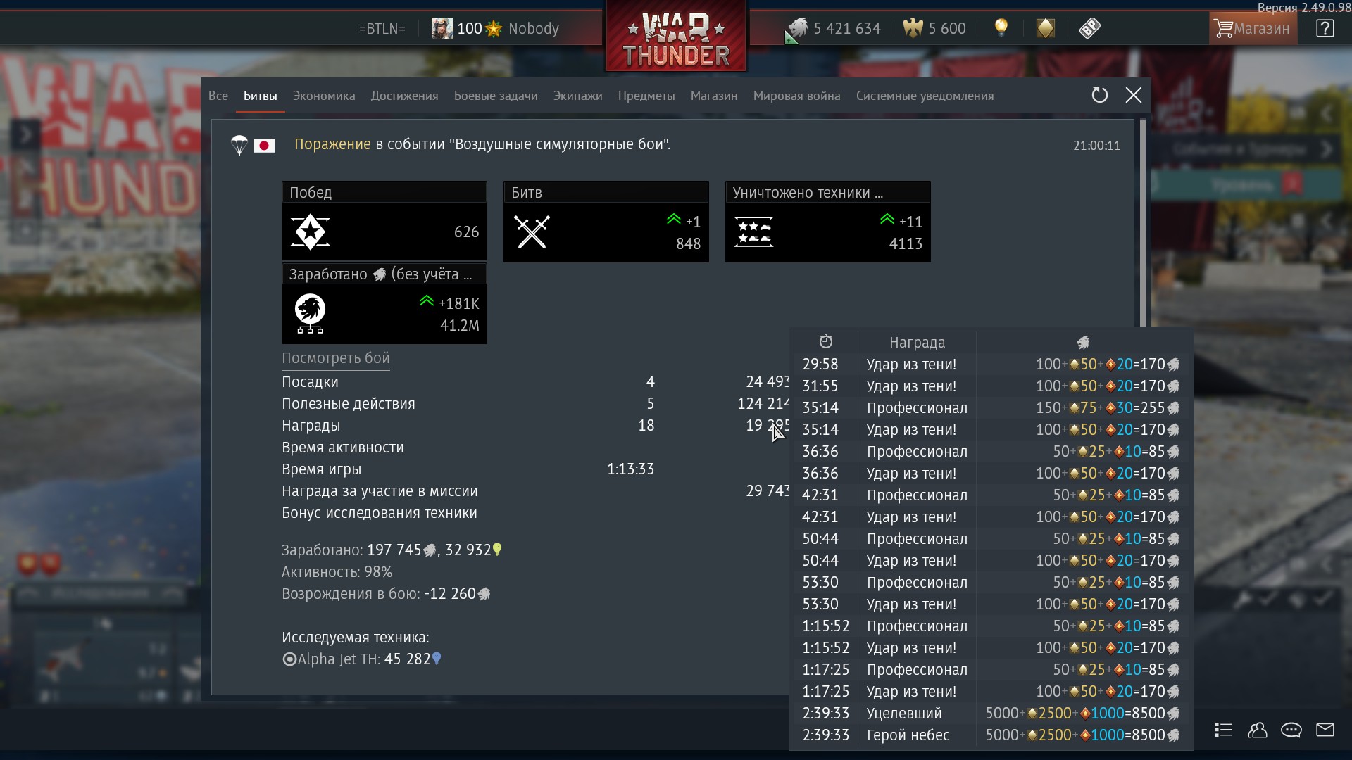 Итак, проведя два боя, я практически закрыл звезду, но не доделал, потому что вышел из второго боя, где проверял фарм очков на истребителе, так как слезы застилали мои глаза от жалости к таким же, как я, пвеешерам, которых мне приходилось убивать ради опытов.