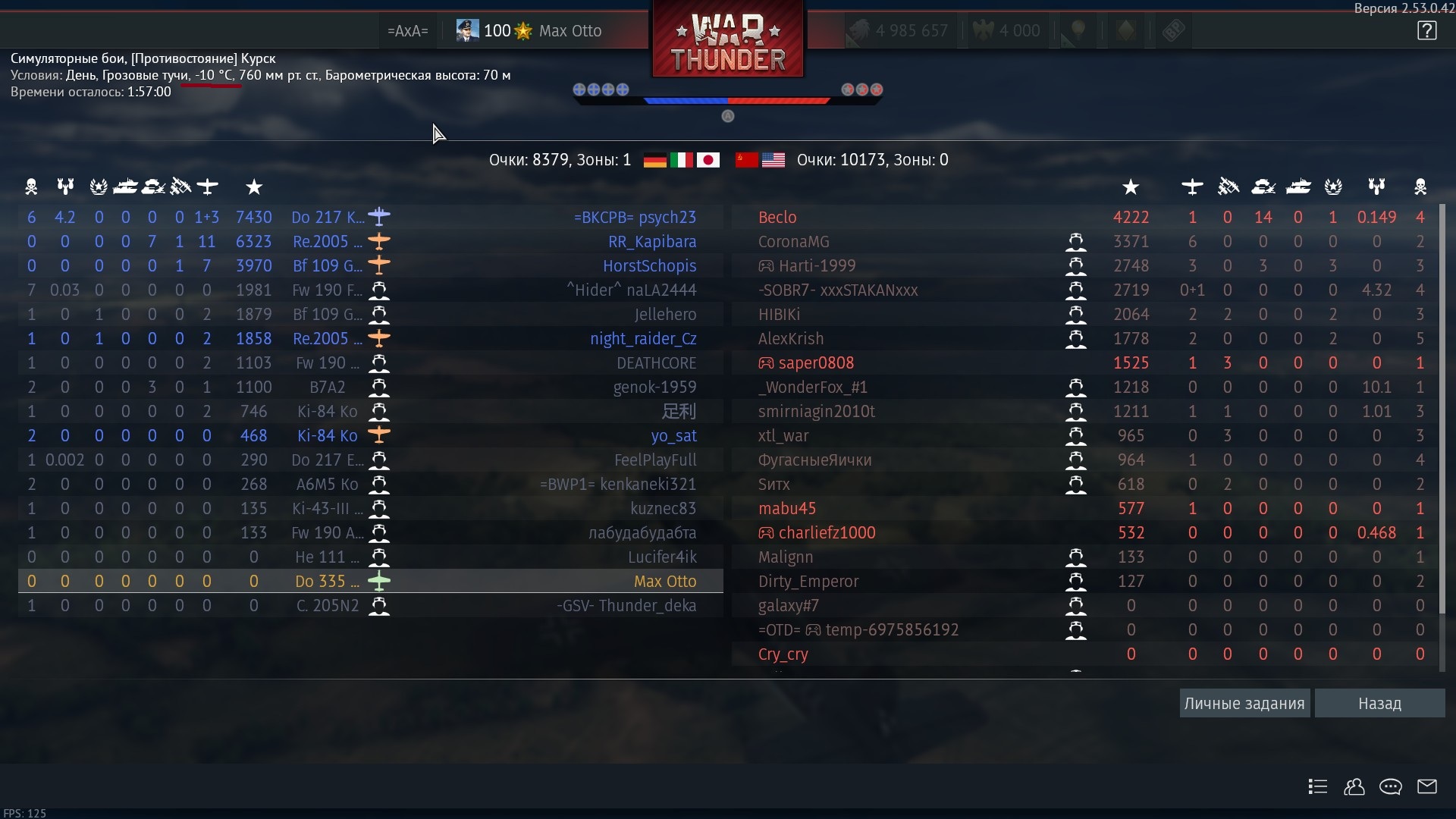 И, что не удивительно, сразу увидел знакомые ники (два с половиной года играю на свистках, никого не знаю). Весло — лучший штурмовик на Ил-2, которого я видел в Тундре, Капибара — первый топ-игрок, которого я сбил, это было, когда еще были часовые сессионки с одной жизнью. Он был на японском трофейном «Корсаре», я — на советском Як-1Б. Остались мы вдвоем, он бумзумил (не виражил и не выделывался, а использовал сильную сторону своего самолета). И когда он промахнулся и пошел опять в набор, я дотянулся и метров с 800, когда он вывесился, послал ему вдогон последние 2 снаряда из пушки. И сбил! И помню до сих пор во всех подробностях, так как для меня это стало значимым успехом. Само собой и потом встречались неоднократно.