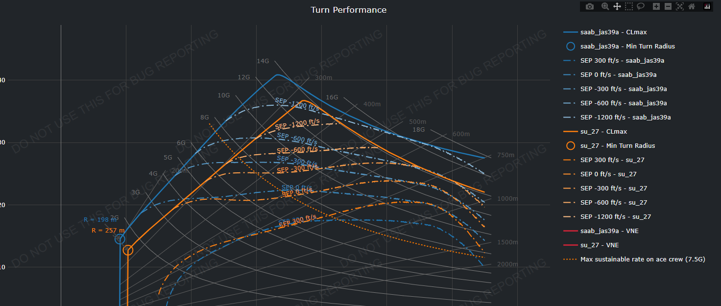 Если оценивать исключительно по данному графику виражных характеристик, в условиях классического ближнего воздушного боя JAS 39A имеет преимущество и статистически навязывает выгодную геометрию боя, что приводит к его победе.