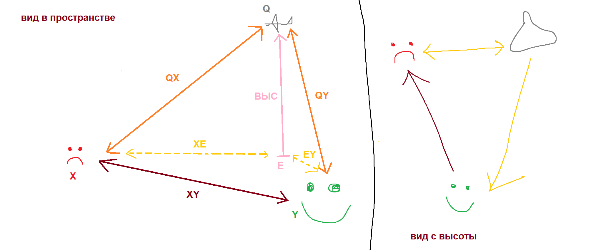 Я так понимаю, что ты предлагаешь искать отрезки XE и EY зная, что они составляют прямоугольный угол и искать его из дальности до цели и радиовысоты дрона. И… зачем? Мне нужна длина отрезка xy, а знаю я длину qx, qy и рвыс, а высчитывать расстояние от нулевой радиовысоты дрона до цели и моего танка не даст ничего. Высчитывать гипотенузы из xe и ey? Ну так угол не будет всегда прямым чтобы сделать это.