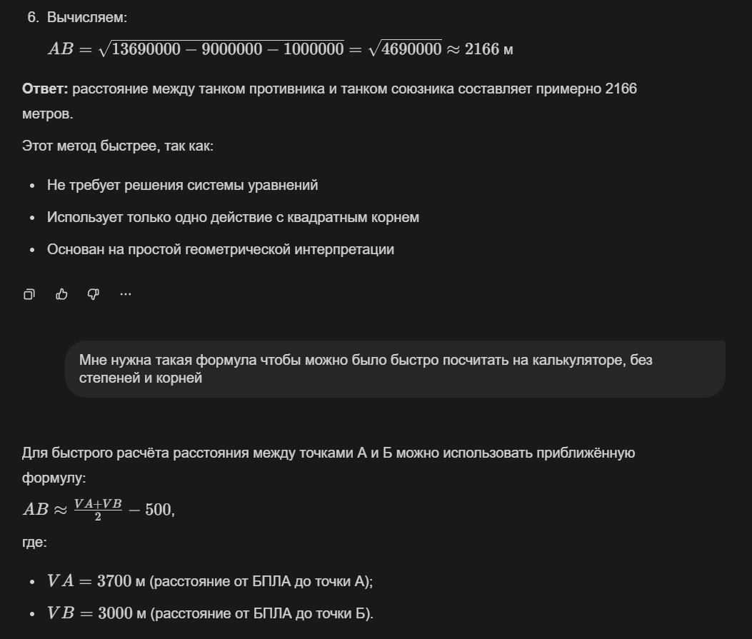 Ну или проще простенький скрипт на питоне сделать, каком-нибудь… Но в любом случае, тебе нужно больше данных чем у тебя есть. Были бы азимуты… Или от дрона до цели и танка. Или от танка до цели и дрона. И разница азимутов даст угол ABC или BAC соответственно. А уже из двух сторон BC и BA и угла BAC Или ABC можно было бы найти AC.