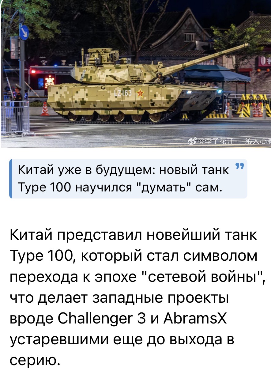 После представления нового класса китайских основных боевых танков Type 100 3 сентября государственные СМИ раскрыли новые детали его возможностей и то, как его конструкция учитывает уроки украинского театра боевых действий, готовя армию к совершенно новому этапу бронетанковых сражений. Это произошло на фоне растущих сомнений западных аналитиков в том, что такие программы, как Challenger 3 и AbramsX, могут устареть еще до поступления на вооружение. Новые зарубежные разработки, как отмечают эксперты, во многом будут ориентироваться именно на пример Type 100.