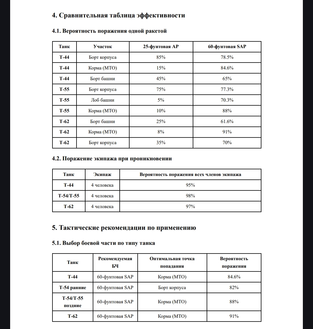 Инвми словами при попадании в борт/МТО/крышу башни вероятность пробития ракетой и уничтожения экипажа более 70%. При пробитии крыши башни подрыв ВВ уничтожает весь экипаж гарантированно, при пробитии МТО происходит подрыв ВВ в МТО, уничтожение двигателя, трансмиссии и пробитие перегородки между МТО и БО, поражение экипажа как осколками, так и давлением, практически гарантировано уничтожение всего экипажа, при пробитии борта танка - уничтожение всего экипажа.