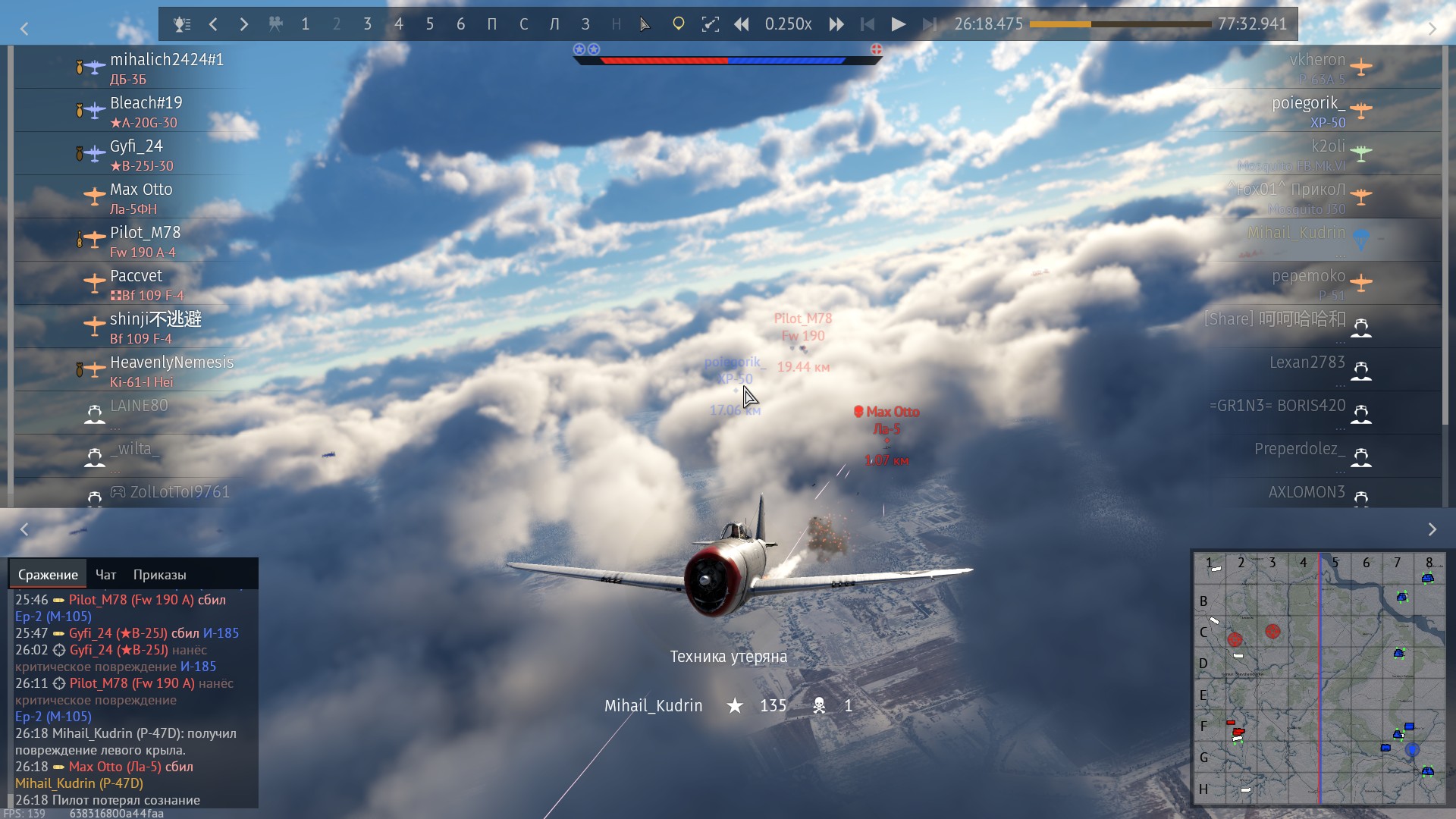 Зашел посмотреть клиентский повтор, надо было узнать, с какой дистанции я снял одного гуся, который выделывался, летая на своем р-47 вверх-вниз. Заодно и посмотрел один эпизод тимкилла, что интересно, первого тимкилла, челик одного и того же бобра дважды завалил, и что примечательно, в команде противников в-25-х не было).