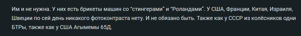 Им и не нужна. У них есть брикеты машин со “стингерами” и “Роландами”. У США, Франции, Китая, Израиля, Швеции по сей день никакого фотоконтраста нету. И не обязано быть. Также как у СССР из колёсников одни БТРы, также как у США Агымемы 65Д.