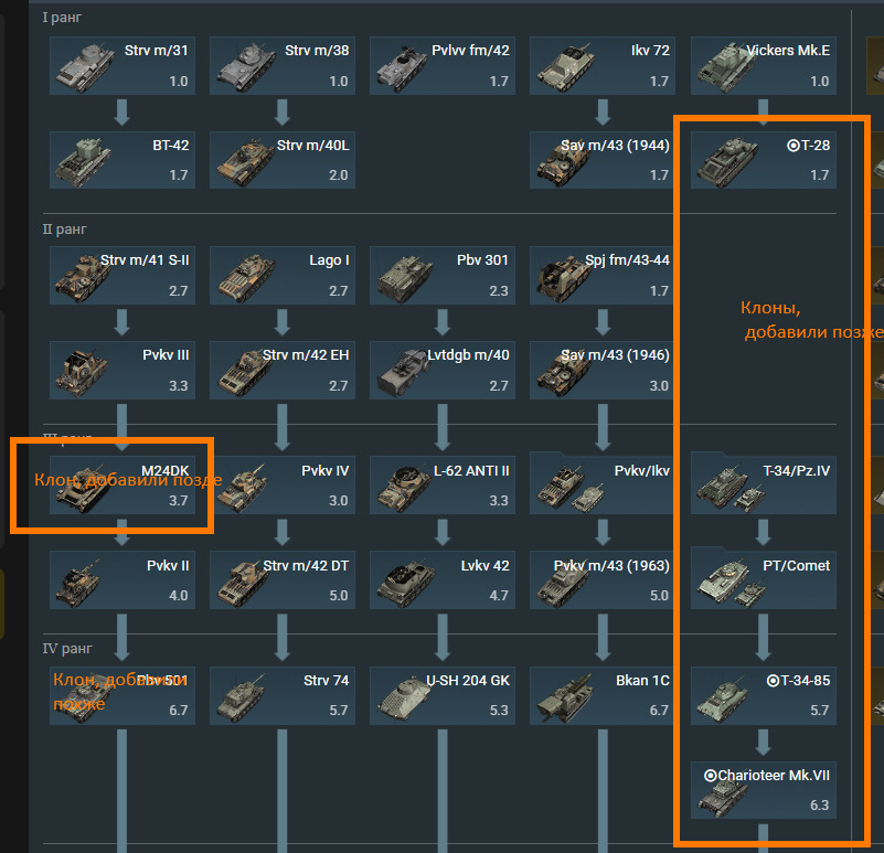 Именно. И с самого ввода шведов у них клонов откровенных не было, там почти вся ветка уникальная была. А потом подветка финляндии - фактически один уникальный танк и куча клонов. Два уникальных танка с натяжкой.