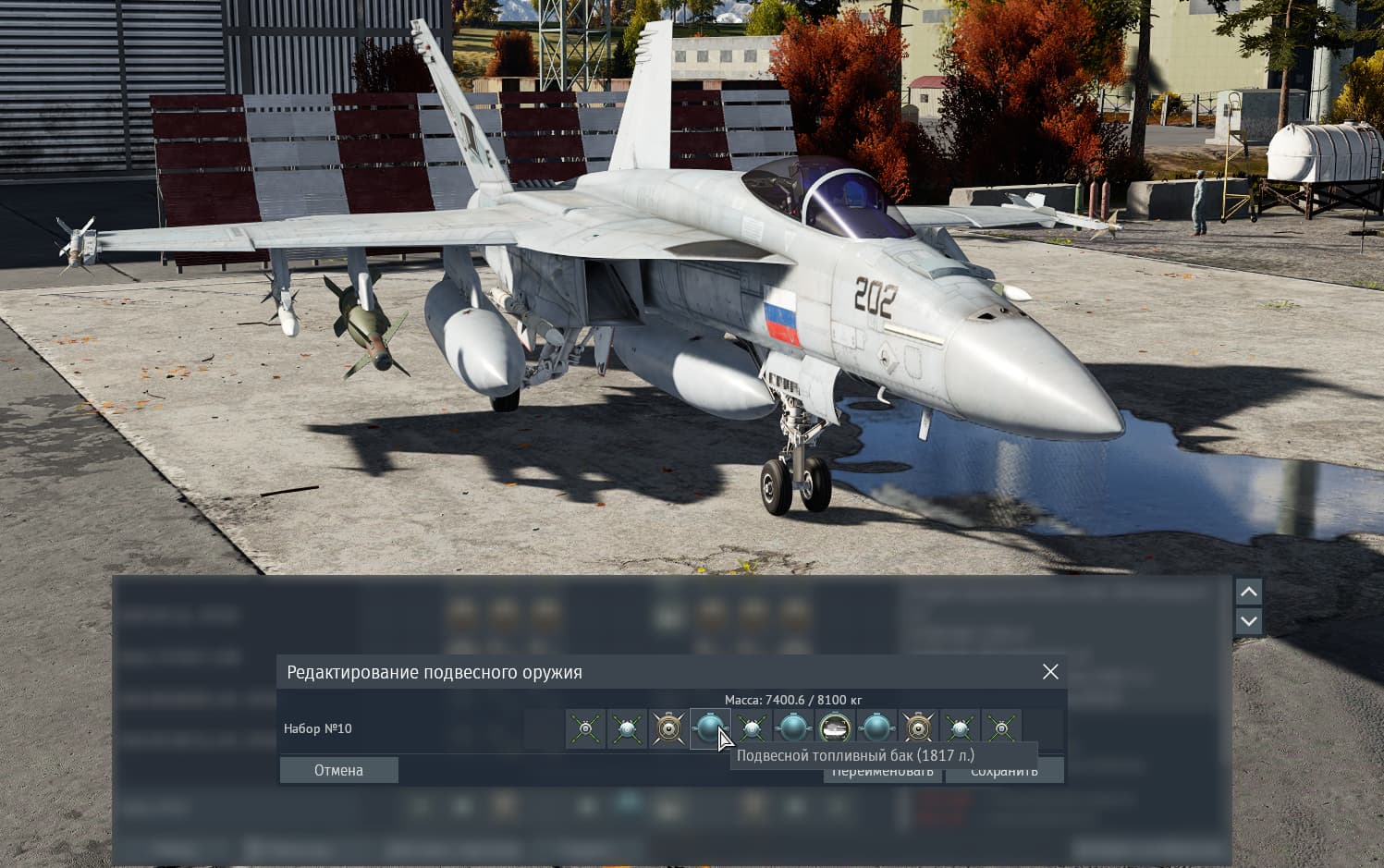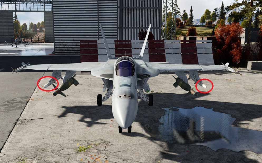 на дальних пилонах от фюзеляжа (которые добавлены относительно F/A-18С “Хорнет”) в игре мы можем подвесить только по одной ракете УРВВ AIM-120 (В или С-5).
