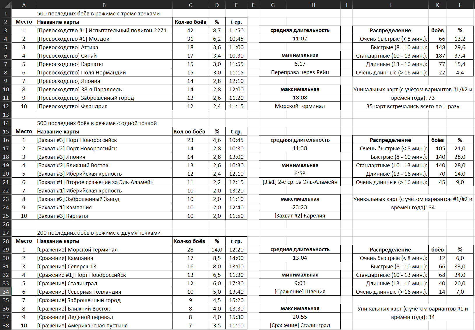 Делать было нечего, решил попарсить малость статистики по длительности боёв и составу карт по режимам в ТРБ, вдруг кому интересно будет